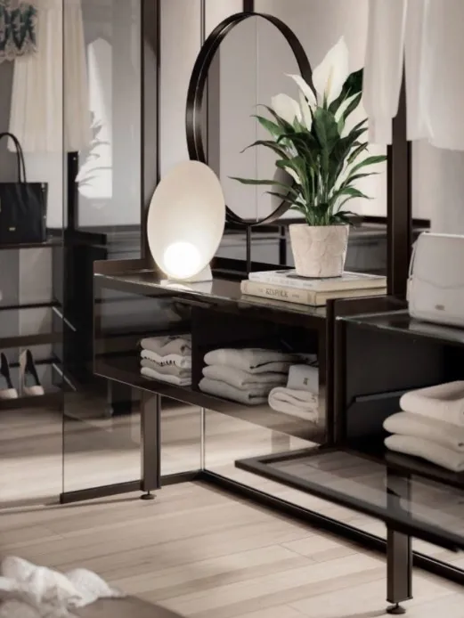 Kristal in questo esempio invece ha i profili terminali per rifinire il vetro e sono in alluminio Champagne abbinati al montante della cabina armadio Venere, il vetro è Trasparente Extrachiaro.