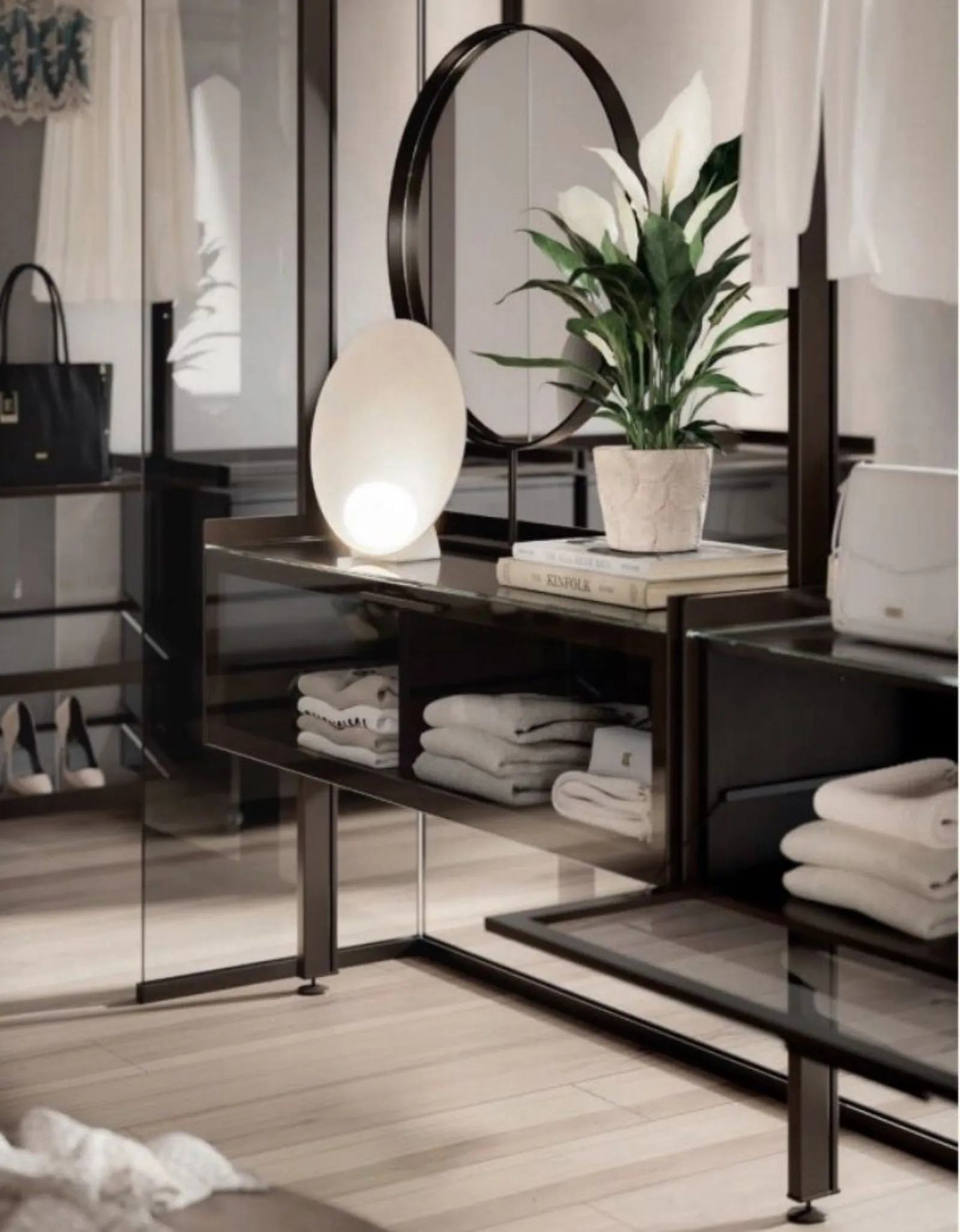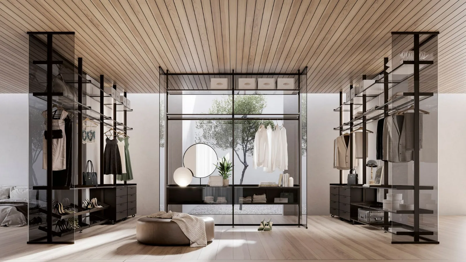 Kristal in vetro avvolge e determina lo spazio lasciando passare la luce, i profili in alluminio Brown ed il vetro Fumé ne determinano il carattere con eleganza.