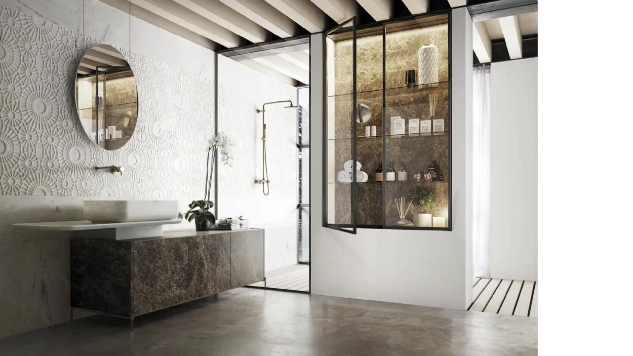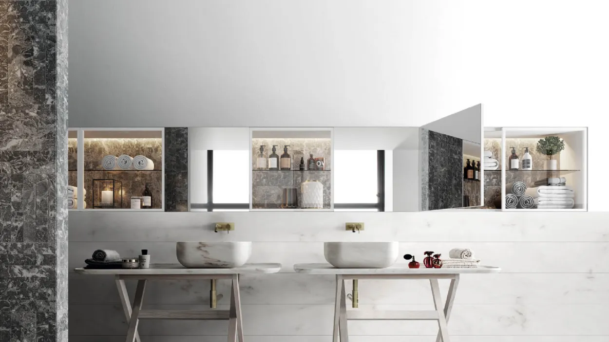 Un’idea originale quella di Doal di usufruire di nicchie filo muro anche nell’ambiente bagno, dove lo spazio è sempre contenuto. La nicchia filo muro permette di sfruttare uno spazio all’interno del muro, arricchendolo con ante cieche o trasparenti per dar vita ad un gioco estetico e funzionale. Le pareti con le nicchie filo muro possono essere realizzate completamente su misura, in altezza, in larghezza e anche in profondità. E’ possibile inserire dei ripiani interni in vetro oppure lasciare il vano libero. Nel caso dei bagni si consiglia di posizionare un’anta con lo specchio sopra il lavandino.