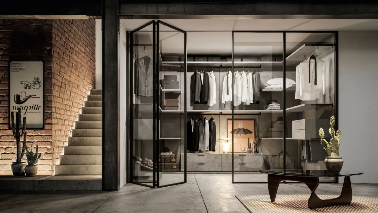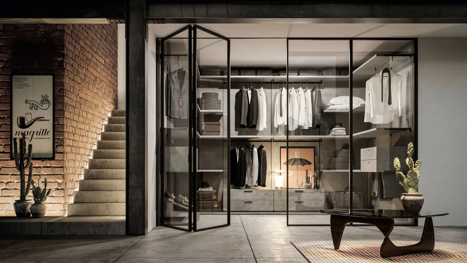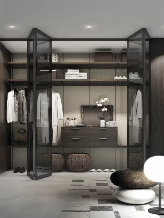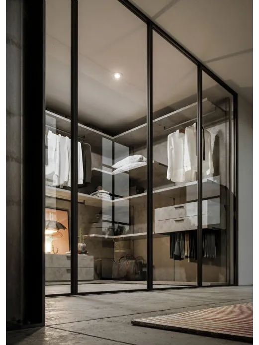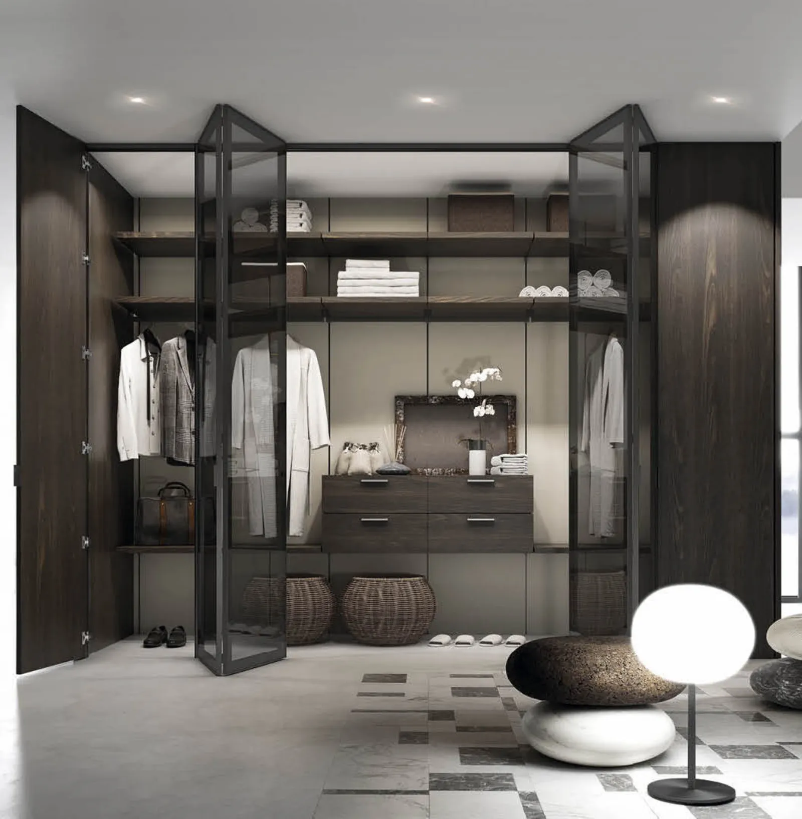 Ecco un esempio funzionale di cabina a cremagliera ad angolo con cassettiere e porta abiti realizzato in nobilitato Matgrey e chiuso con ante a libro in alluminio brown e vetro trasparente.