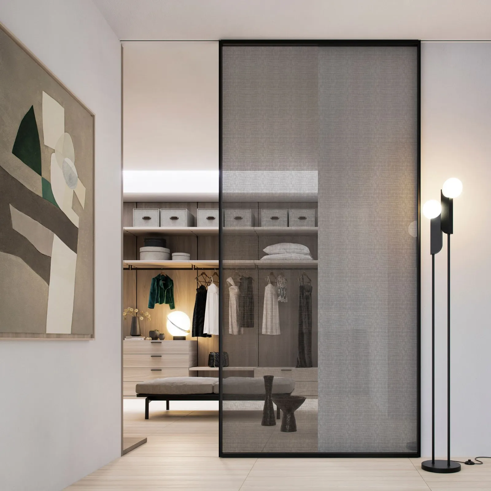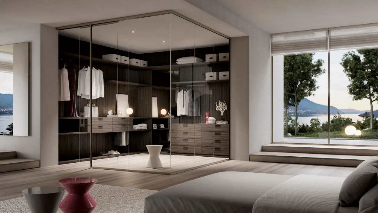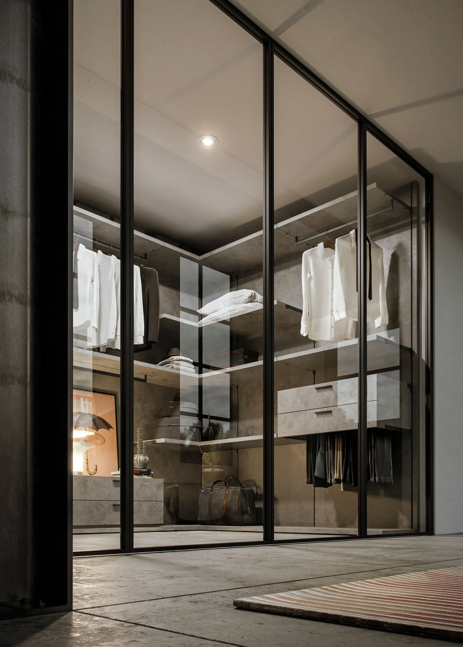 Ecco un esempio funzionale di cabina a cremagliera ad angolo con cassettiere e porta abiti realizzato in nobilitato Matgrey e chiuso con ante a libro in alluminio brown e vetro trasparente.