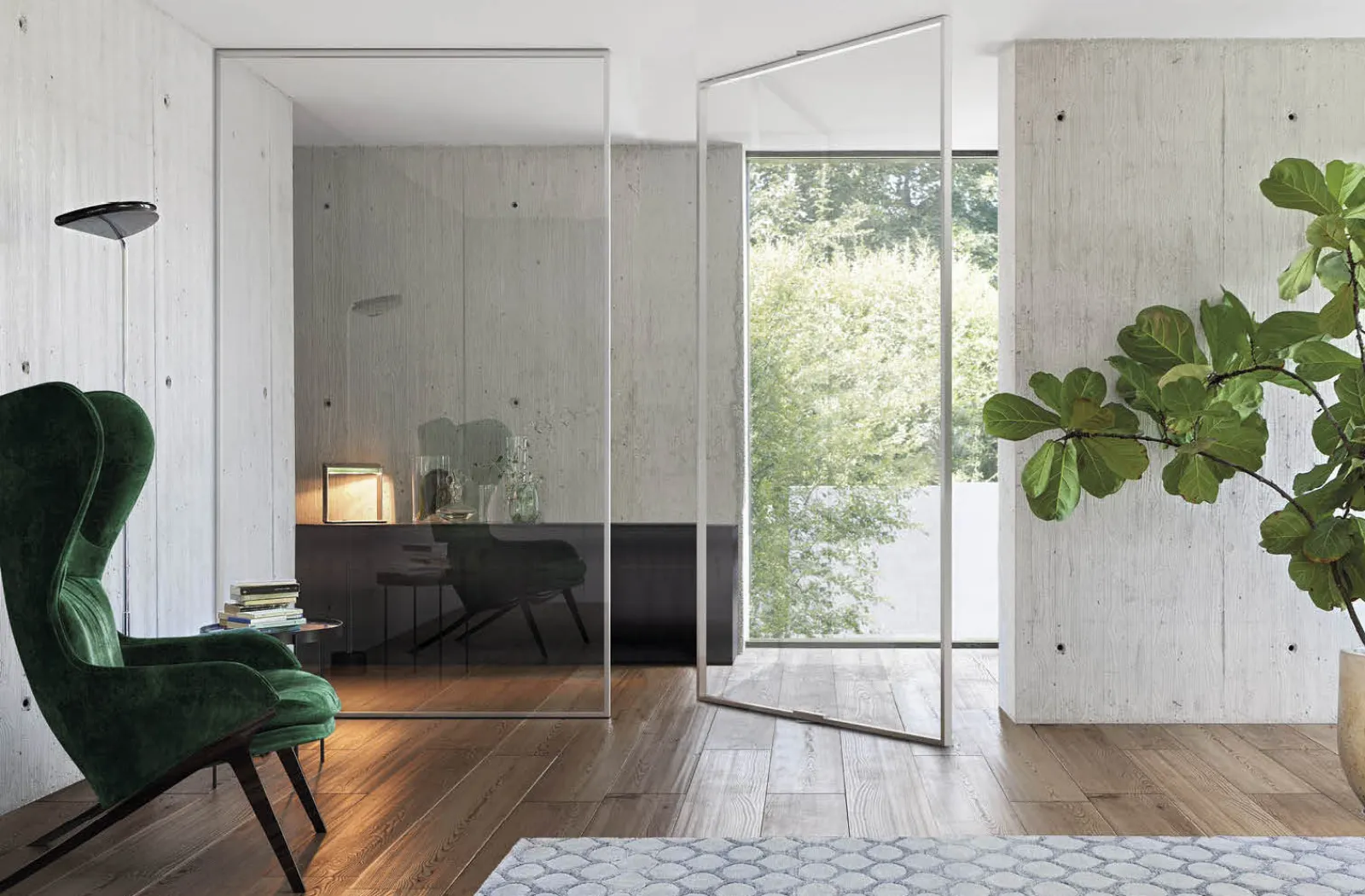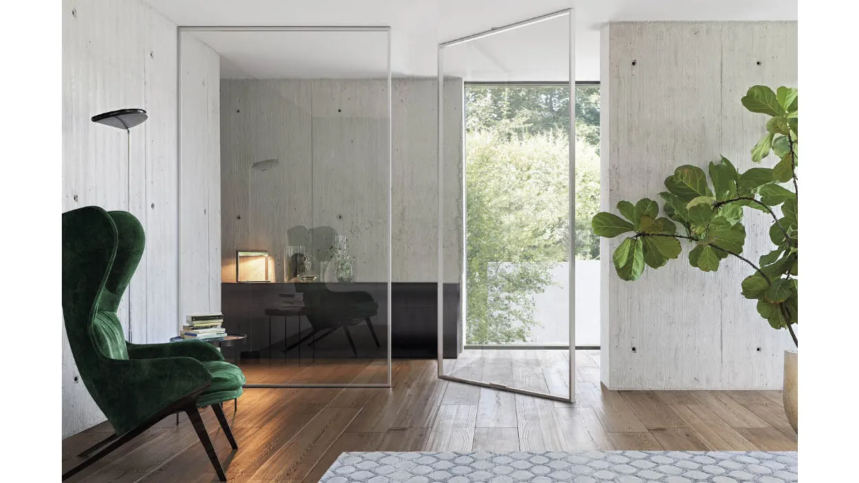 In questa foto la parete divisoria divide l’ambiente del soggiorno da una zona adiacente, creando una stupenda armonia tra design, colore e funzionalità. La parete Gaia è minimalista, composta da un vetro singolo, realizzabile con una delle oltre 30 varianti della collezione Doal.