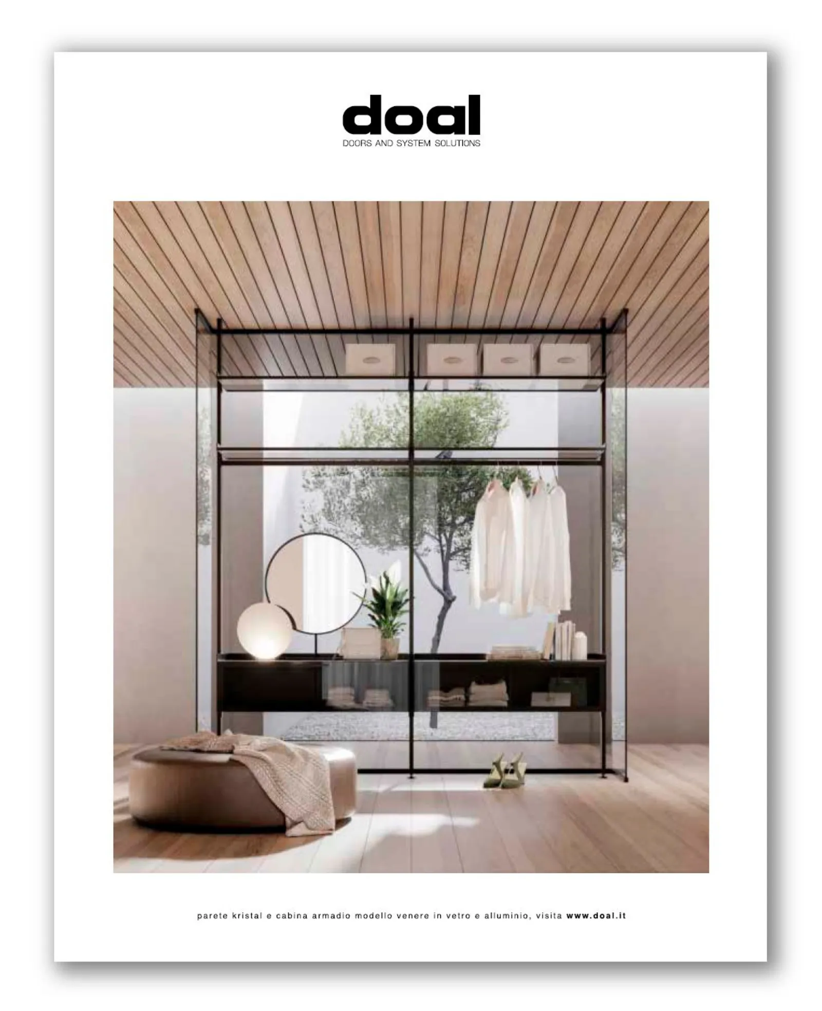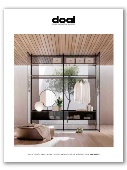 La cabina armadio Venere si distingue per le sue molteplici possibilità d'installazione, a muro, a soffitto e divisoria, in questo caso è accompagnata dalla parete in vetro e alluminio Kristal creando una moltitudine di riflessi grazie al vetro a tutta altezza che contorna l’arredo, un design moderno e contemporaneo che soddisfa i gusti più raffinati.