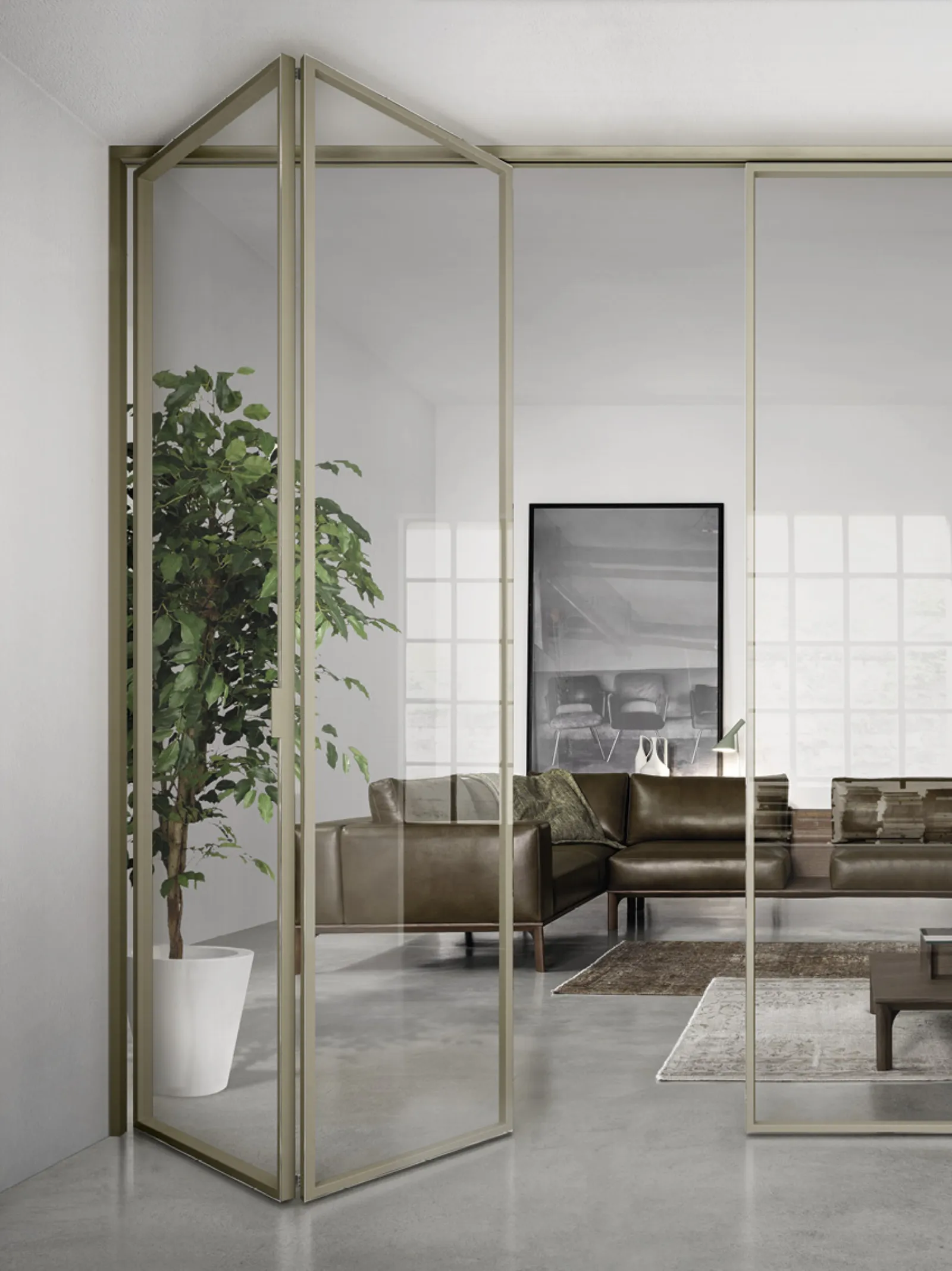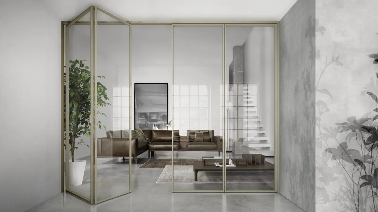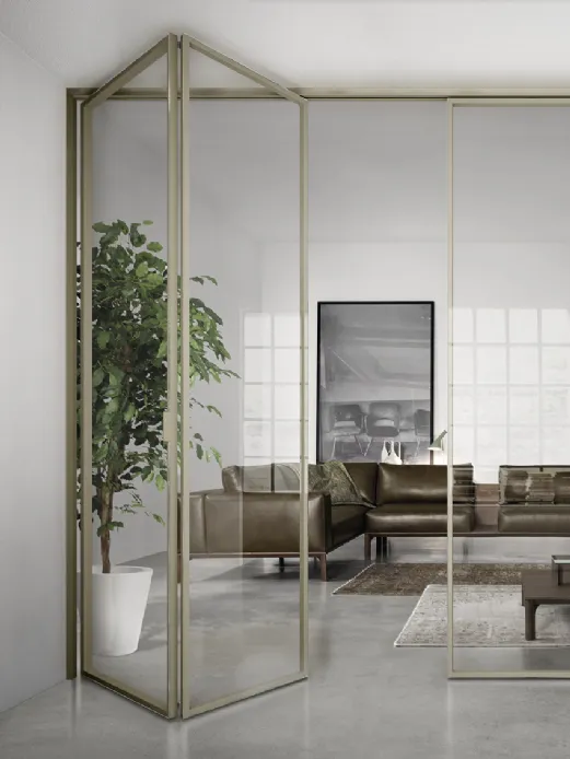 La porta Gaia a libro si caratterizza per il vetro su un lato del profilo in alluminio che le dona, ad ante chiuse, un effetto a filo. Quando invece le porte sono aperte permettono di liberare un'ampia zona di passaggio, che può arrivare fino ad oltre tre metri nel caso di due coppie di porte contrapposte.