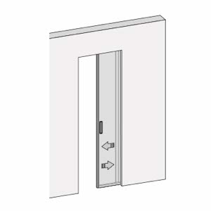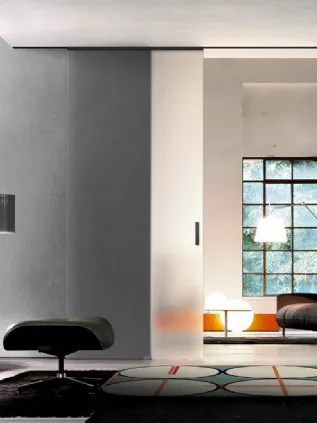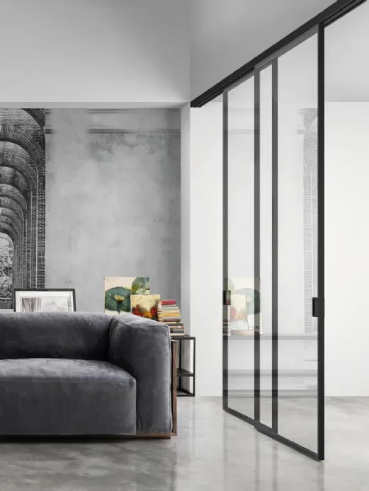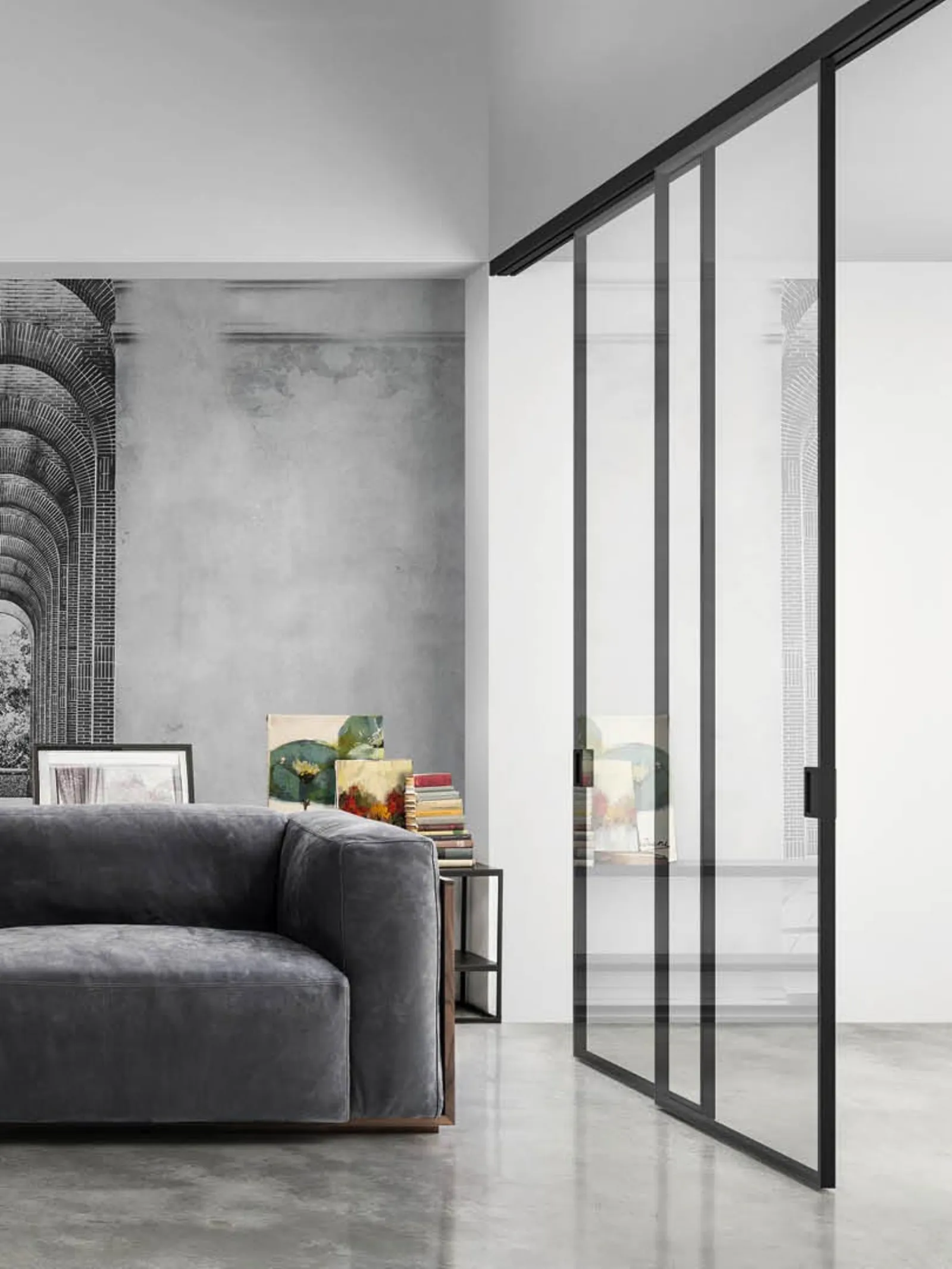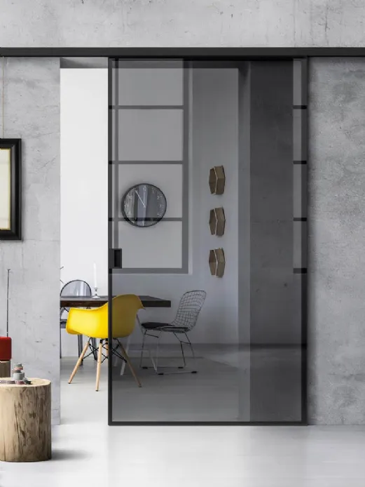 La Gaia scorrevole sospesa su binario esterno muro permette di far scorrere una porta su una parete laterale per aprire il vano di passaggio. Il binario può anche continuare lungo tutta la parete per maggior armonia estetica, come nel caso di questa immagine con porta con profili antracite e vetro fumé.