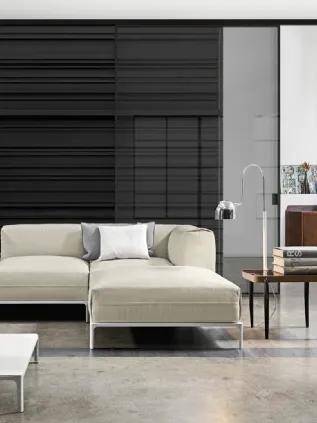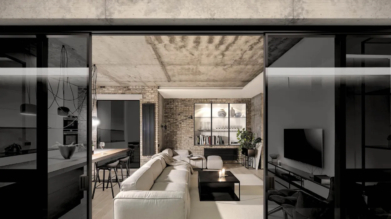 Con le porte vetro/alluminio si possono creare abbinamenti di vari tipi tra profili in alluminio e vetri; in quest'immagine il profilo in alluminio brown della porta Gaia stacca completamente rispetto al vetro reflex chiaro che risulta trasparente quando la stanza interna è illuminata e riflettente quando questa è buia.