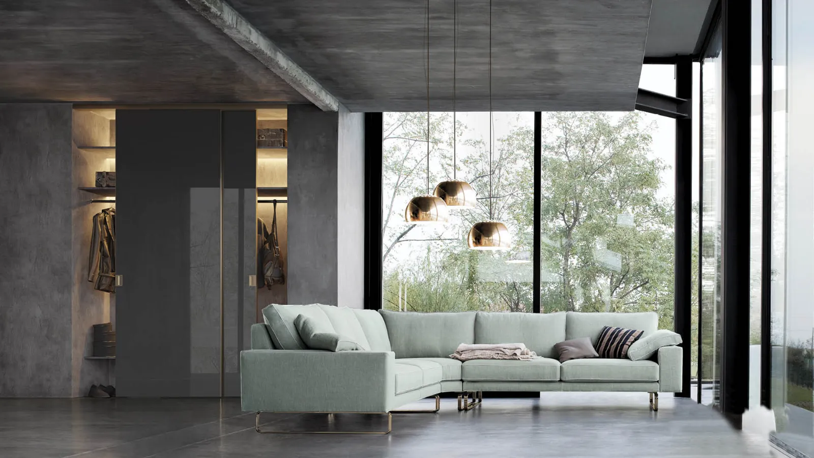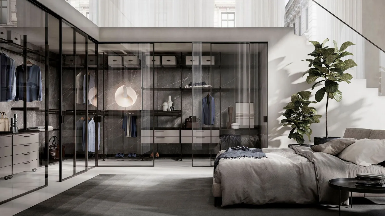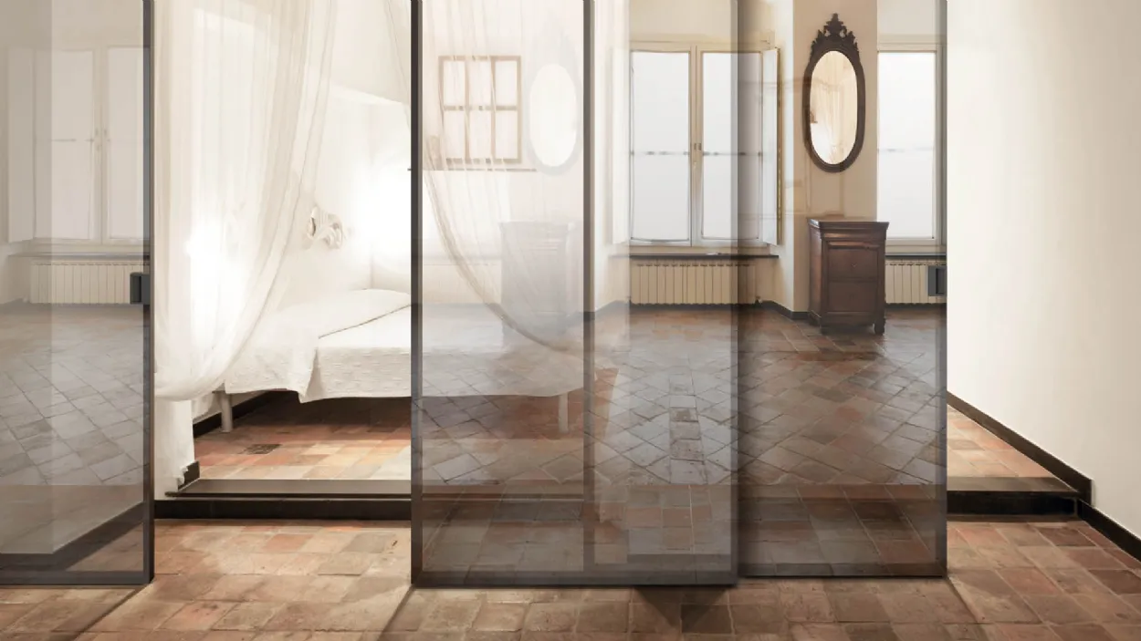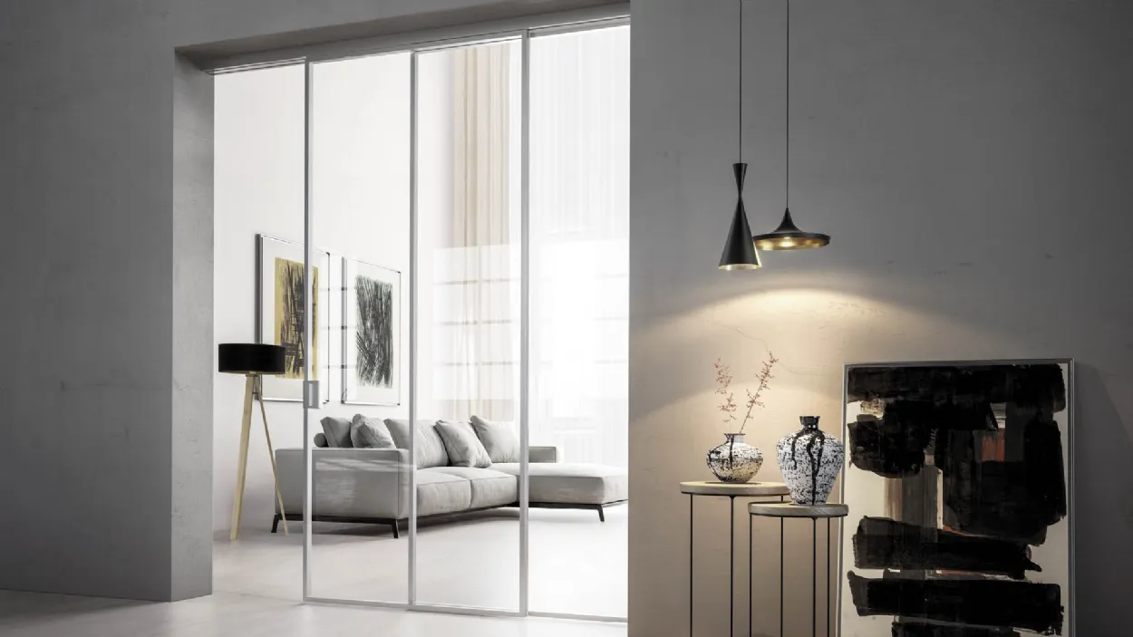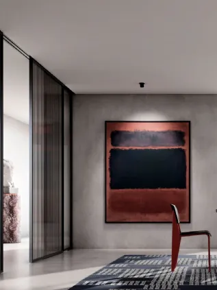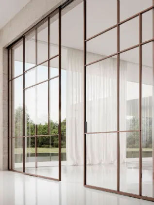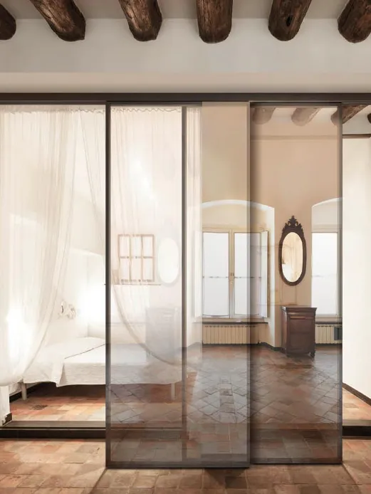 La Gaia scorrevole sospesa garantisce effetti estetici molto particolari con vetri riflettenti che rendono appena percettibile il segno perimetrale del profilo in alluminio. In quest'immagine i profili brown sono nascosti da vetri reflex bronzo, in una composizione con una porta fissa al centro e 2 porte scorrevoli per i vani di passaggio laterali.