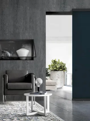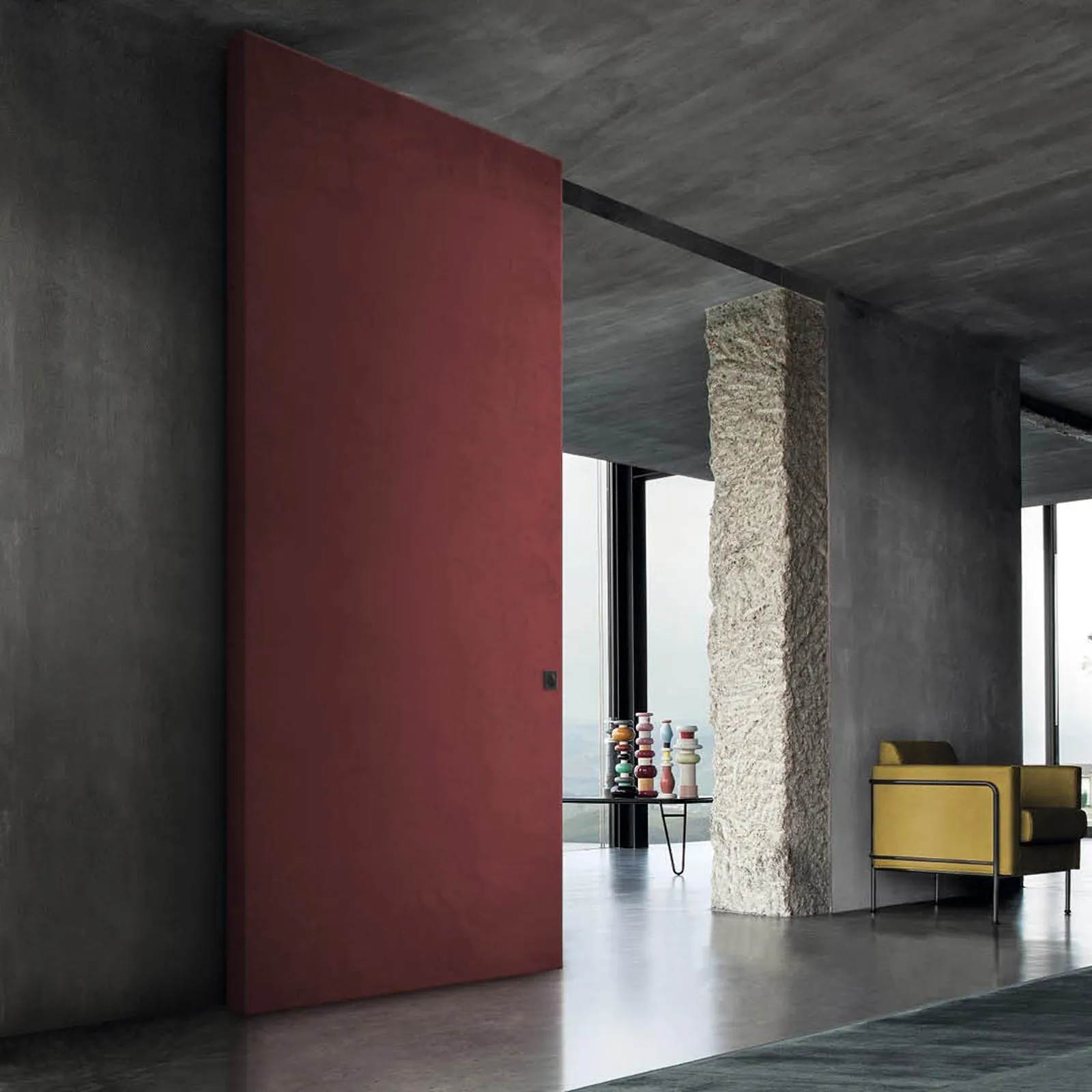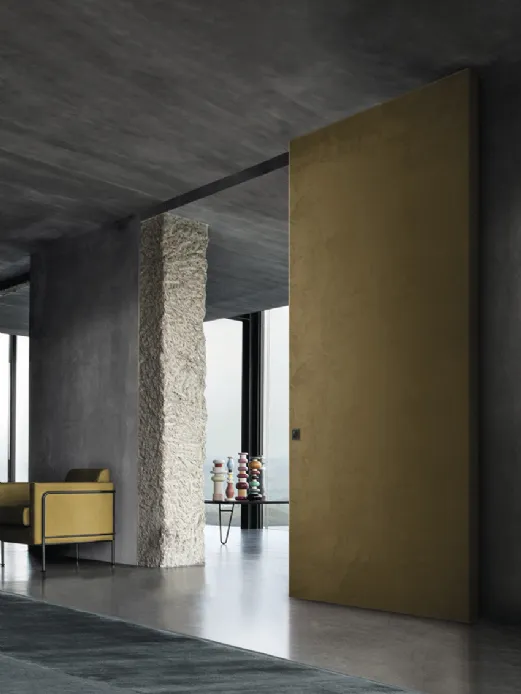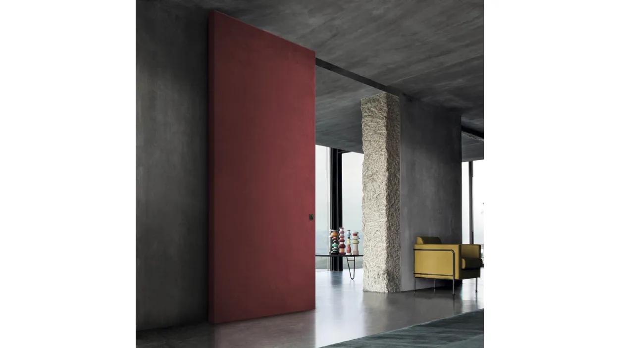La porta Gea Scorrevole Invisibile è disponibile in laminato, laccata, da rivestire con carta da parati o da tinteggiare come la parete. In quest'ultimo caso, come nell'immagine qui a fianco, si ottiene l'effetto di una porzione di muro che trasla, senza la percezione di avere una porta a dividere i due ambienti.