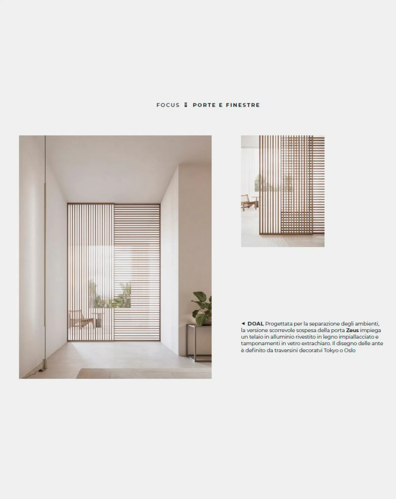 Progettata per la separazione degli ambienti, la versione scorrevole sospesa della porta Zeus impiega un telaio in alluminio rivestito in legno impiallacciato e tamponamenti in vetro extrachiaro. Il disegno delle ante è definito da traversini decoratvi Tokyo o Oslo. Leggi l'articolo su The Book.