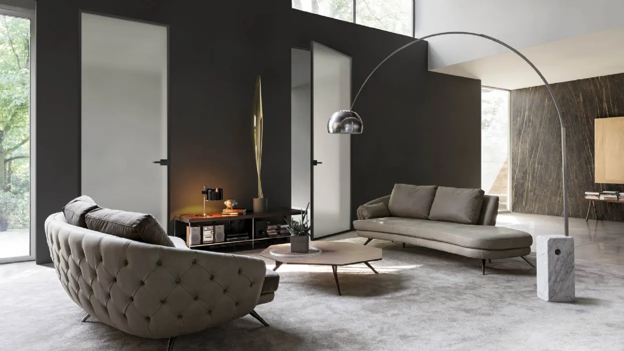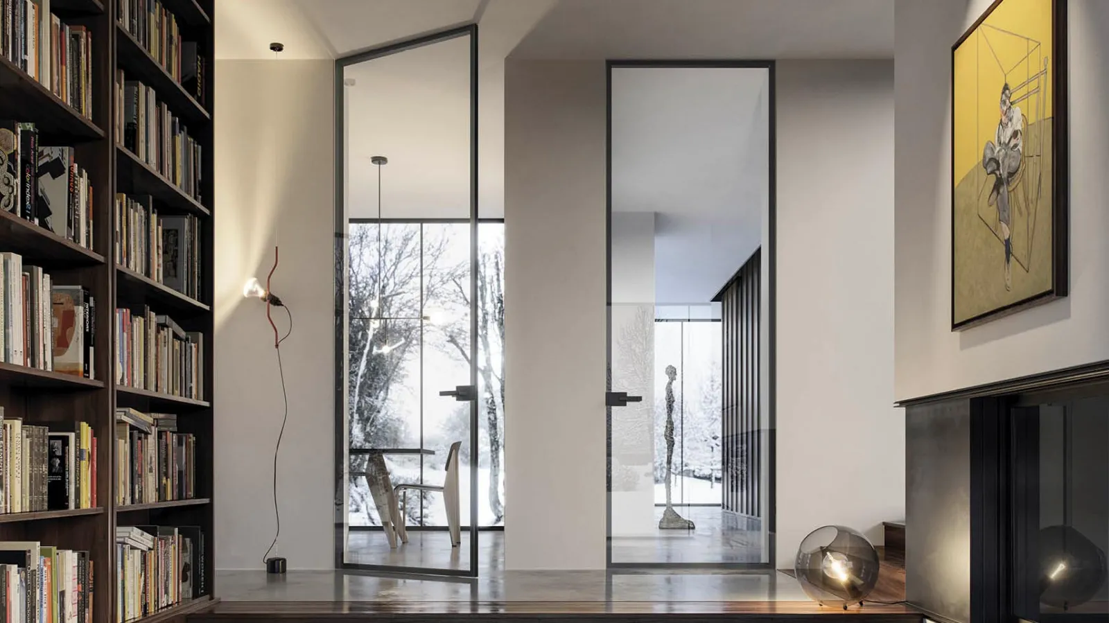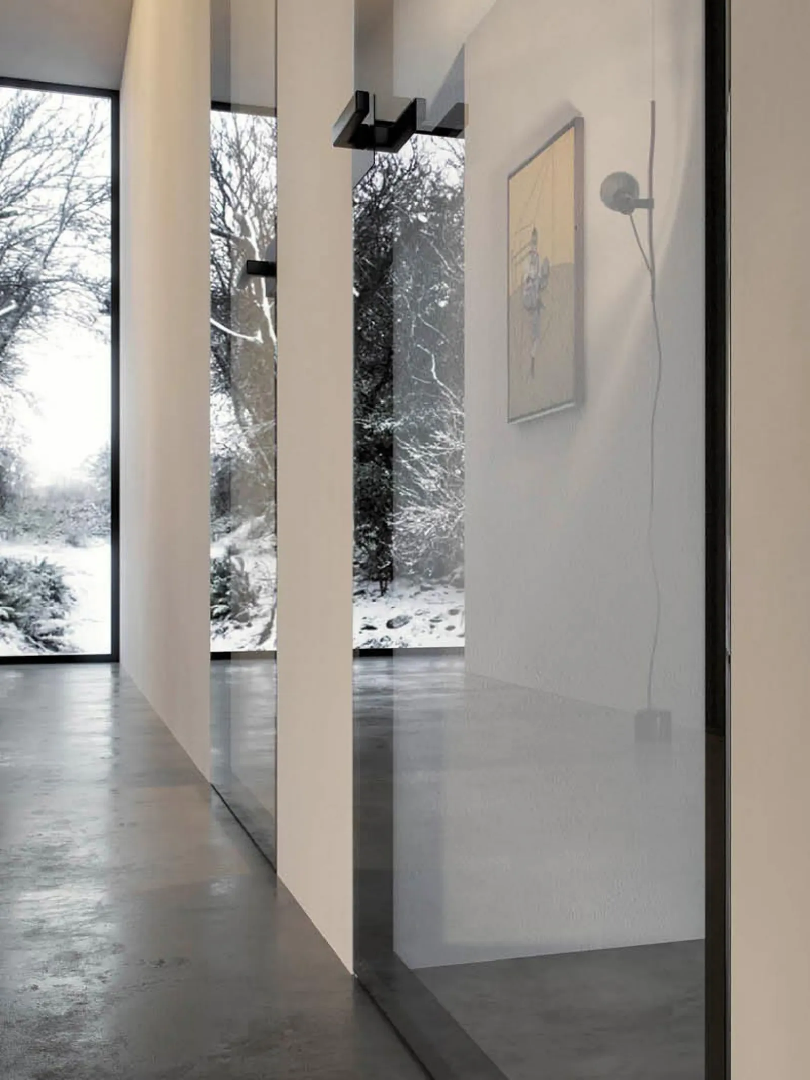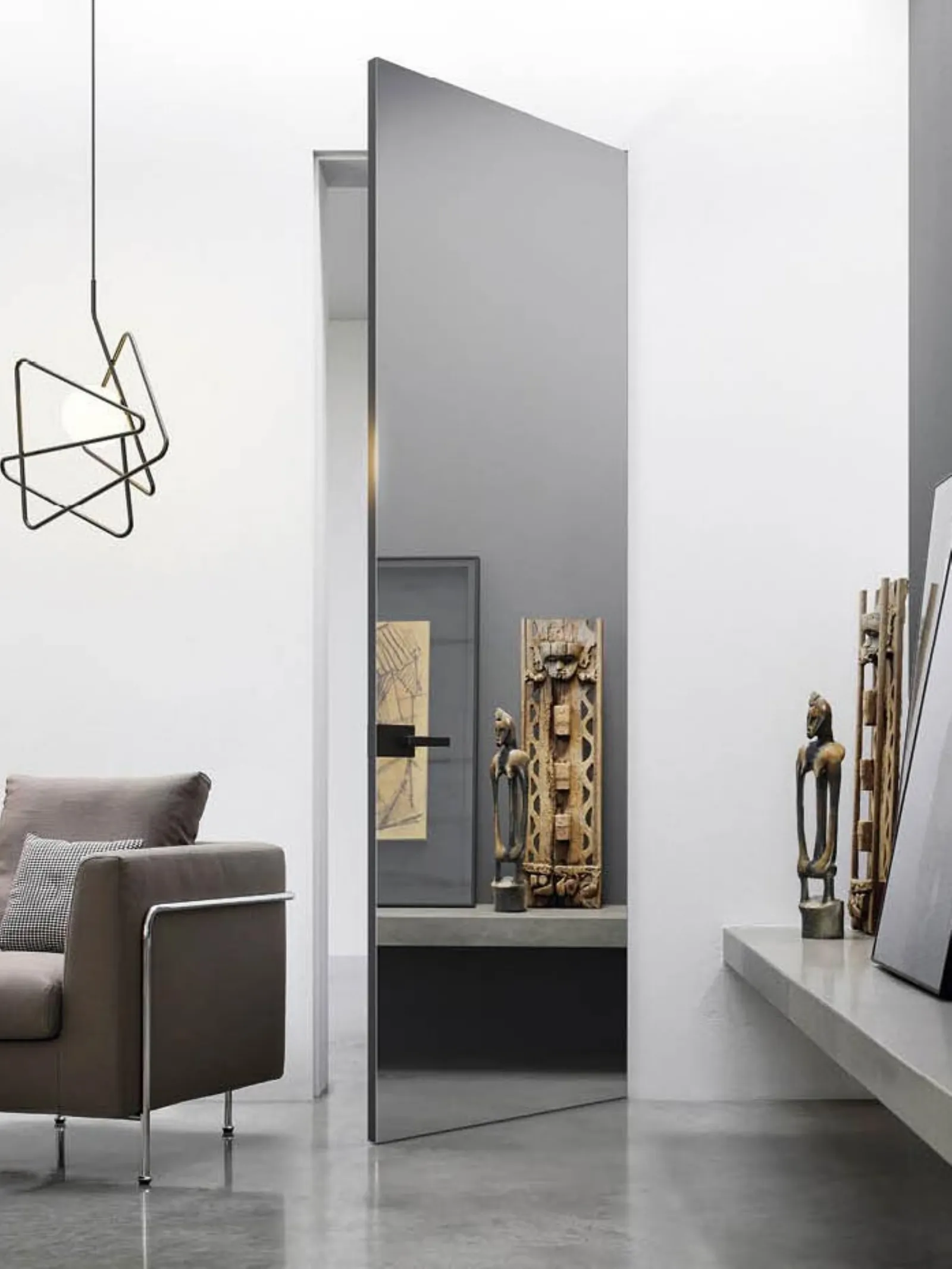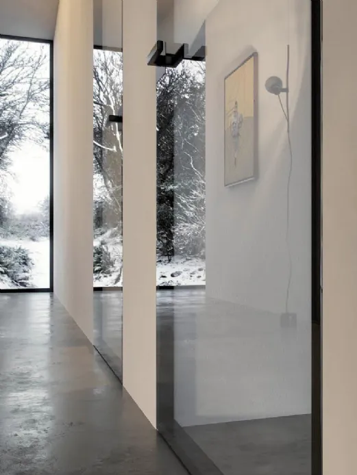 La porta Just battente filo muro permette di avere un vetro perfettamente a filo della parete, senza elementi in alluminio a vista tra muro e vetro. Quando si sceglie un vetro a specchio si ottiene quindi l'effetto di uno specchio filo muro che in realtà si può aprire per entrare all'interno della stanza, dentro la quale si ha un altro specchio anche sul lato interno.