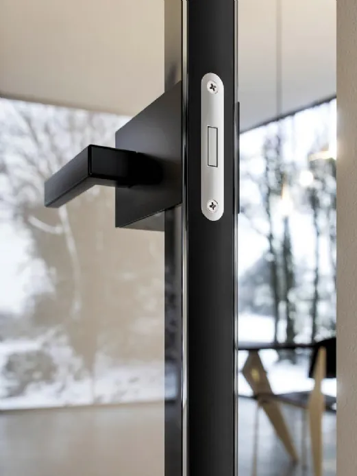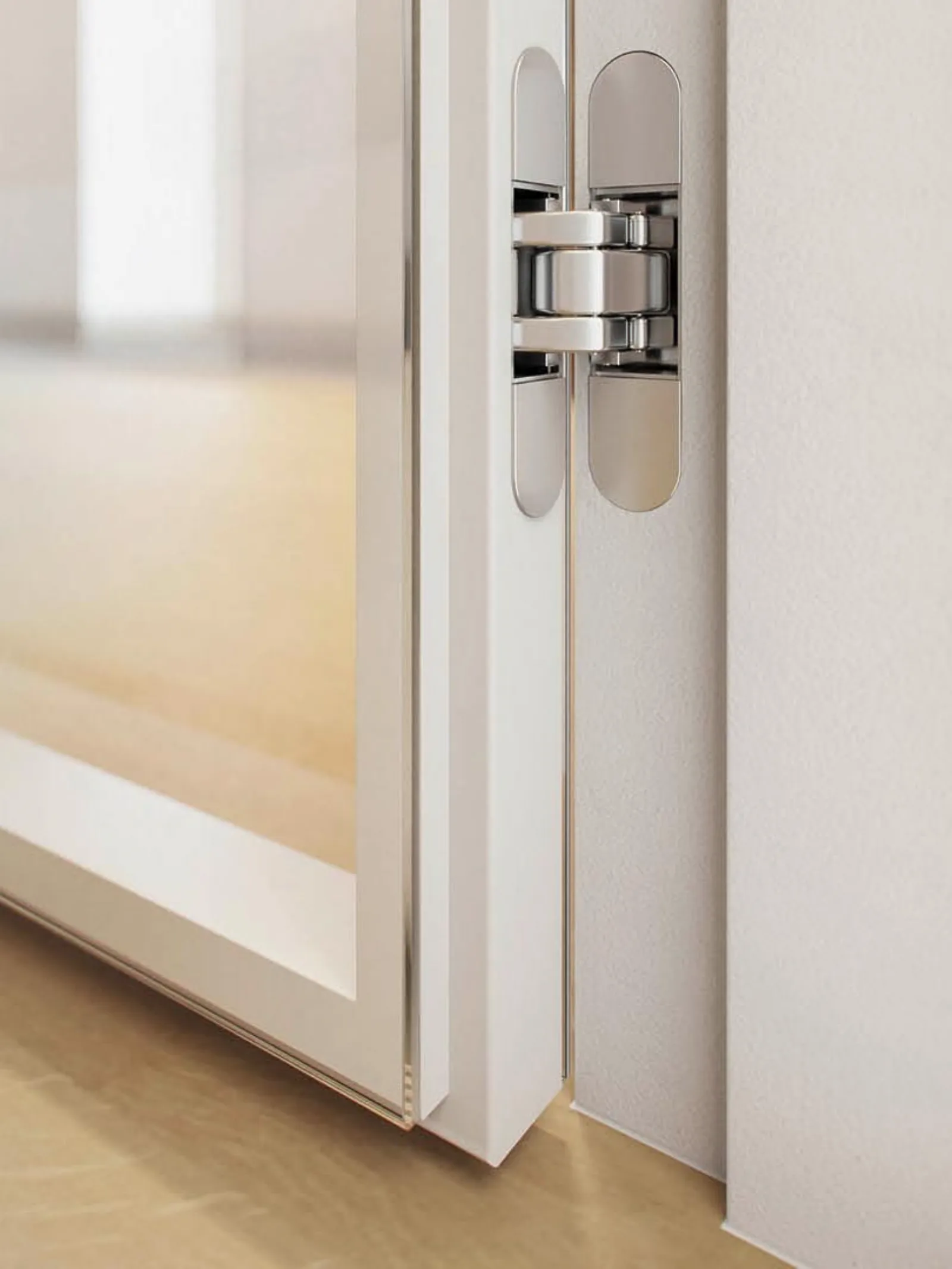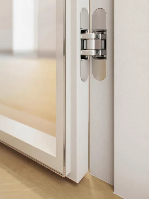 La Just battente filo muro presenta cerniere a scomparsa incassate sul profilo verticale in alluminio, che restano completamente nascoste, a porta chiusa, per mantenere una perfetta pulizia estetica. Le cerniere sono regolabili sui 3 assi per agevolare le operazioni di montaggio fornendo una maggiore tolleranza.