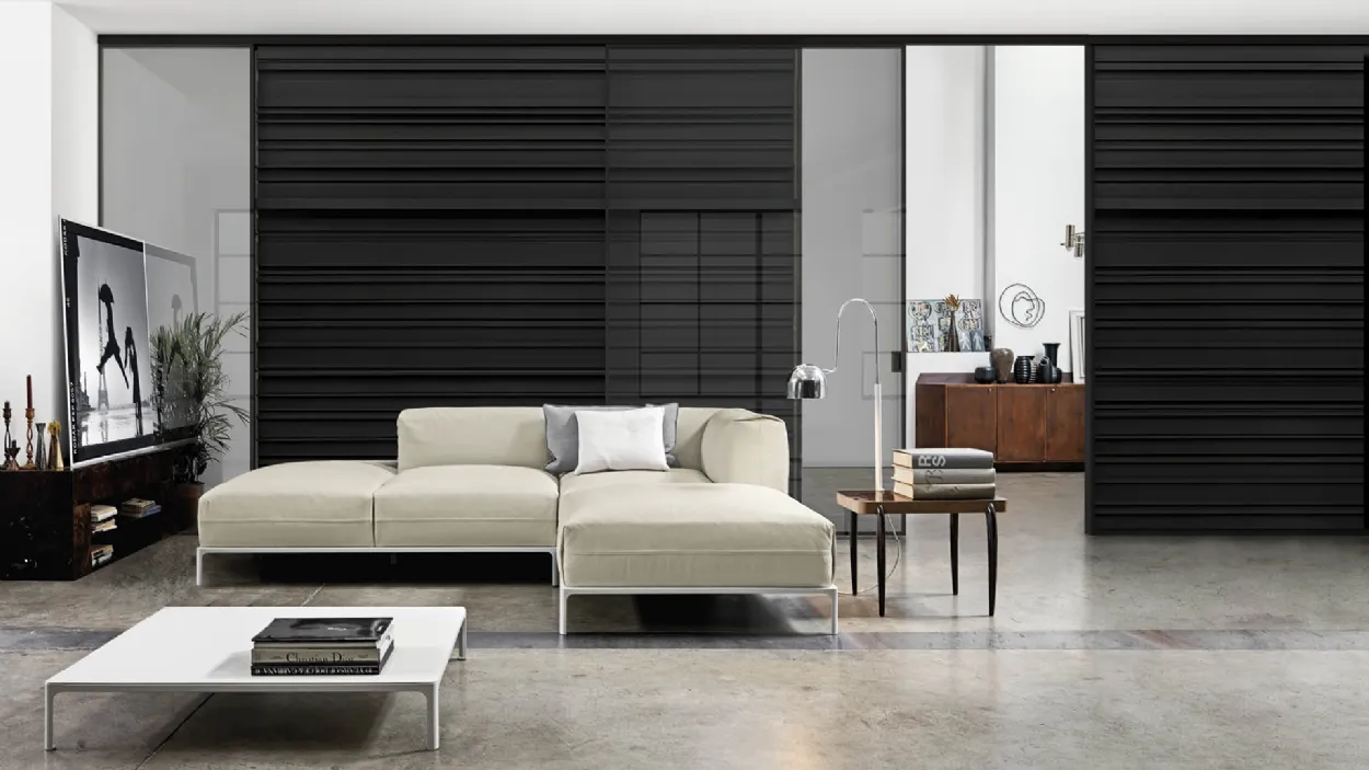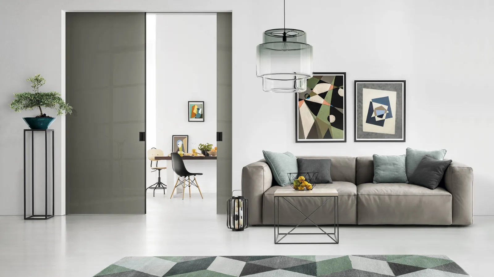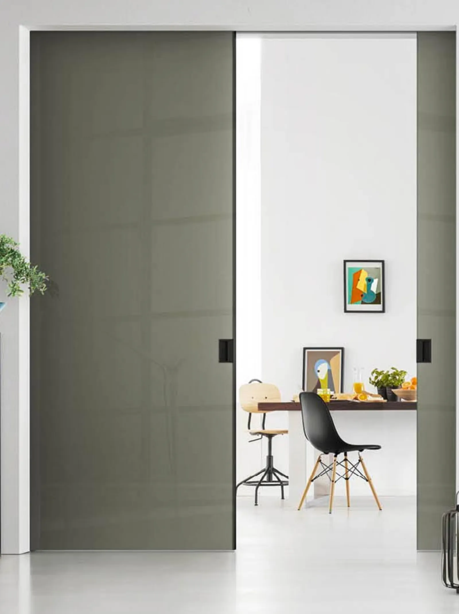 Per la Just scorrevole sospesa si possono scegliere svariate tipologie di vetri, tra quelli che lasciano passare la luce, quelli che la riflettono e quelli che coprono la vista. Nell'immagine qui a fianco, ad esempio, il vetro laccato lucido lucido Terra nasconde completamente il profilo in alluminio brown e l'interno della stanza.