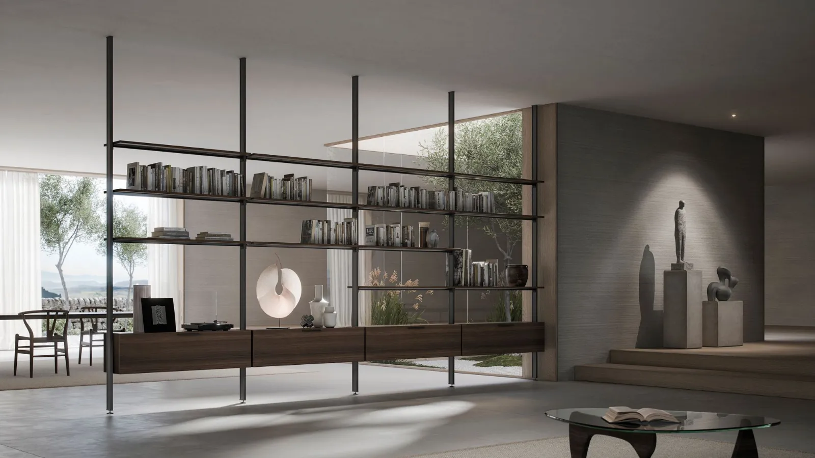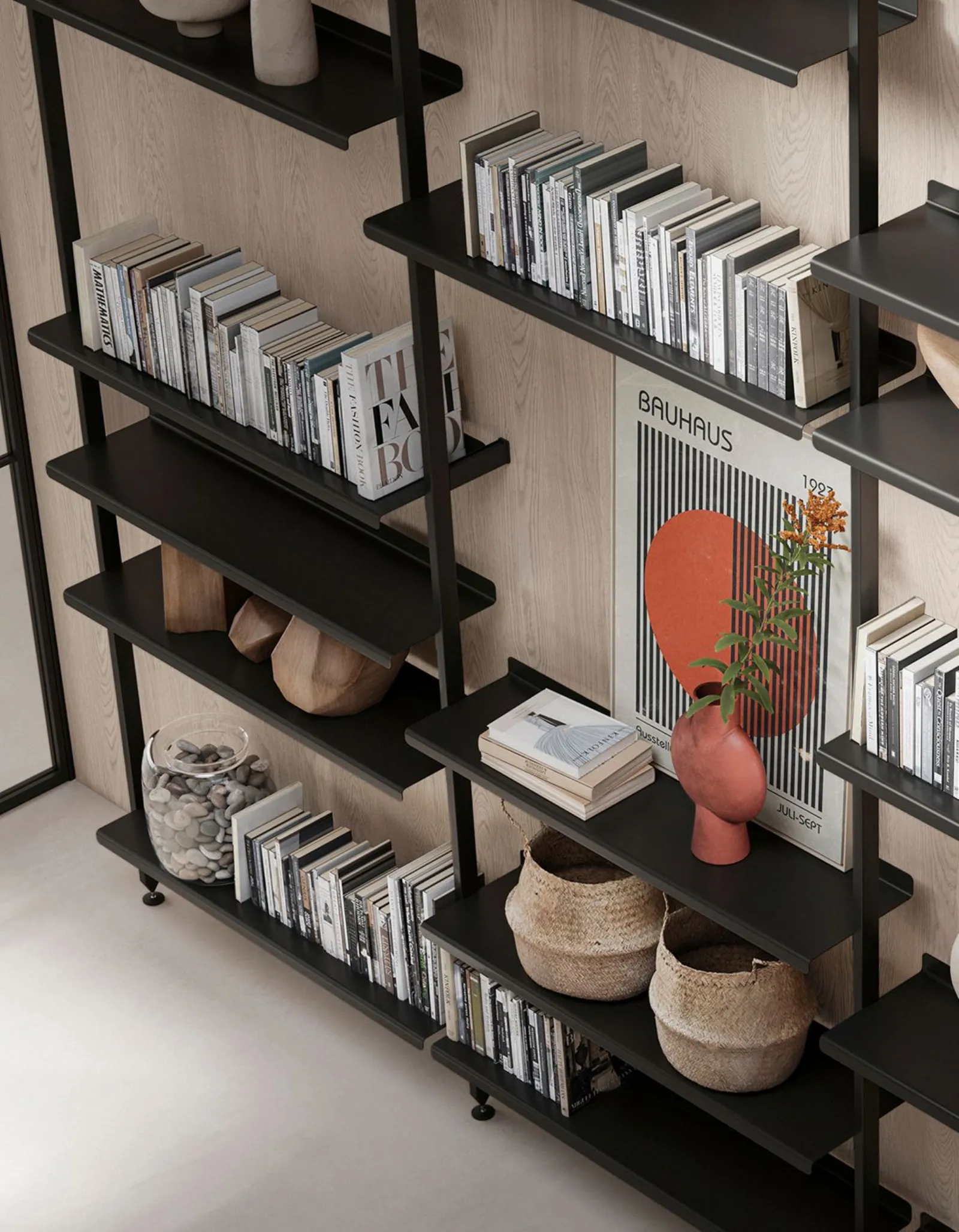 I ripiani in acciaio della libreria Karin sono minimali ma soprattutto funzionali, offrono robustezza e solidità. Lo spazio prende carattere e l’ambiente trova uno stile che nasce dalla stabilità e dal design unico.