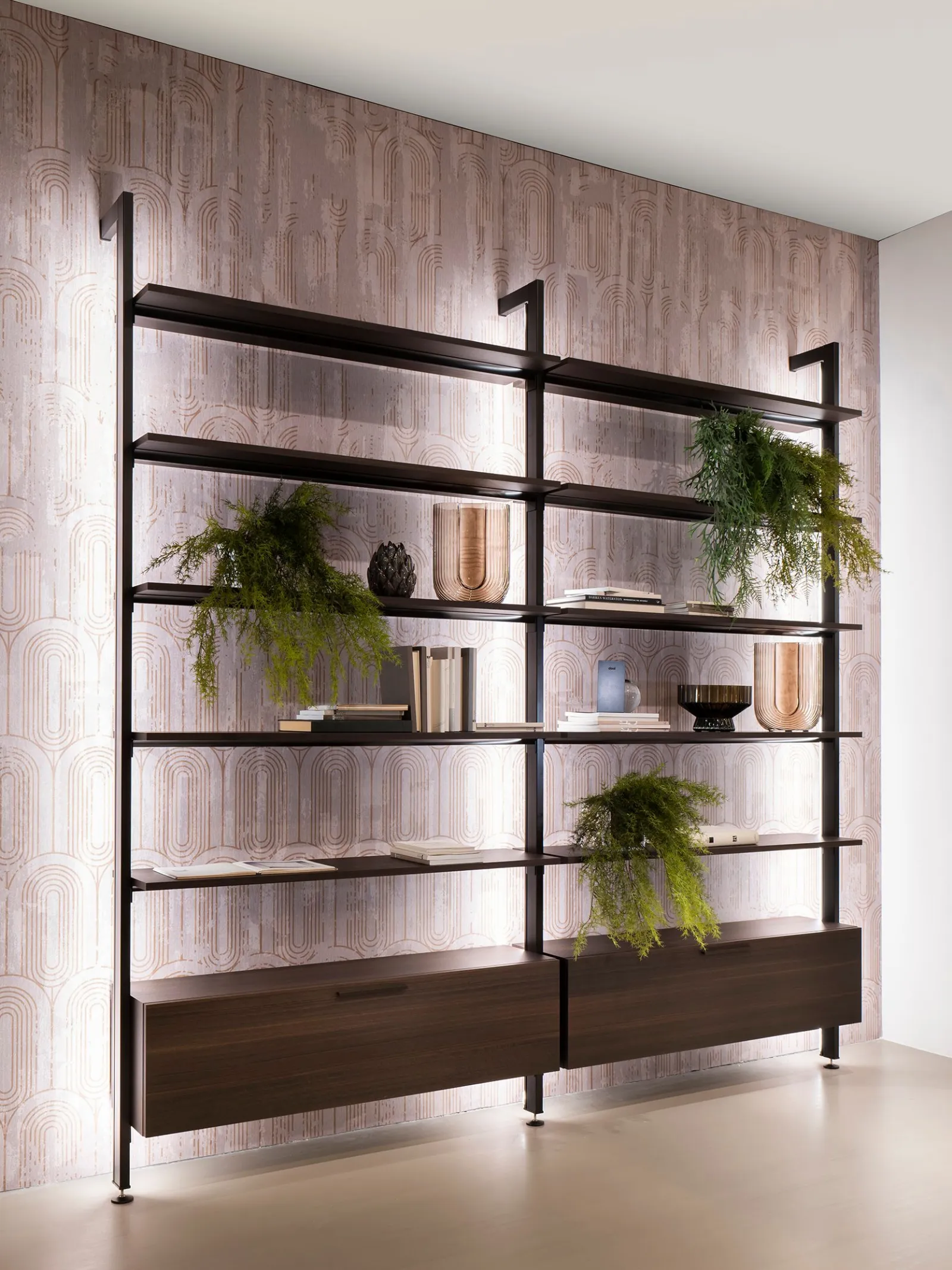 La libreria Karin con profilo in alluminio finitura Brown, con i ripiani e contenitori con anta a ribalta in legno rovere tinto noce impiallacciato crea un design unico, i montanti a parete raggiungono un’altezza massima di H 300 cm e rendono la libreria ancora più robusta con i supporti intermedi, creando volumi definiti ed eleganti.