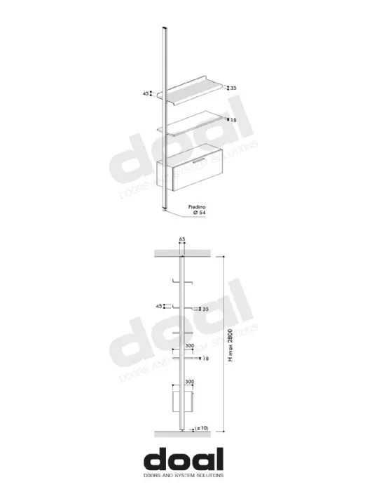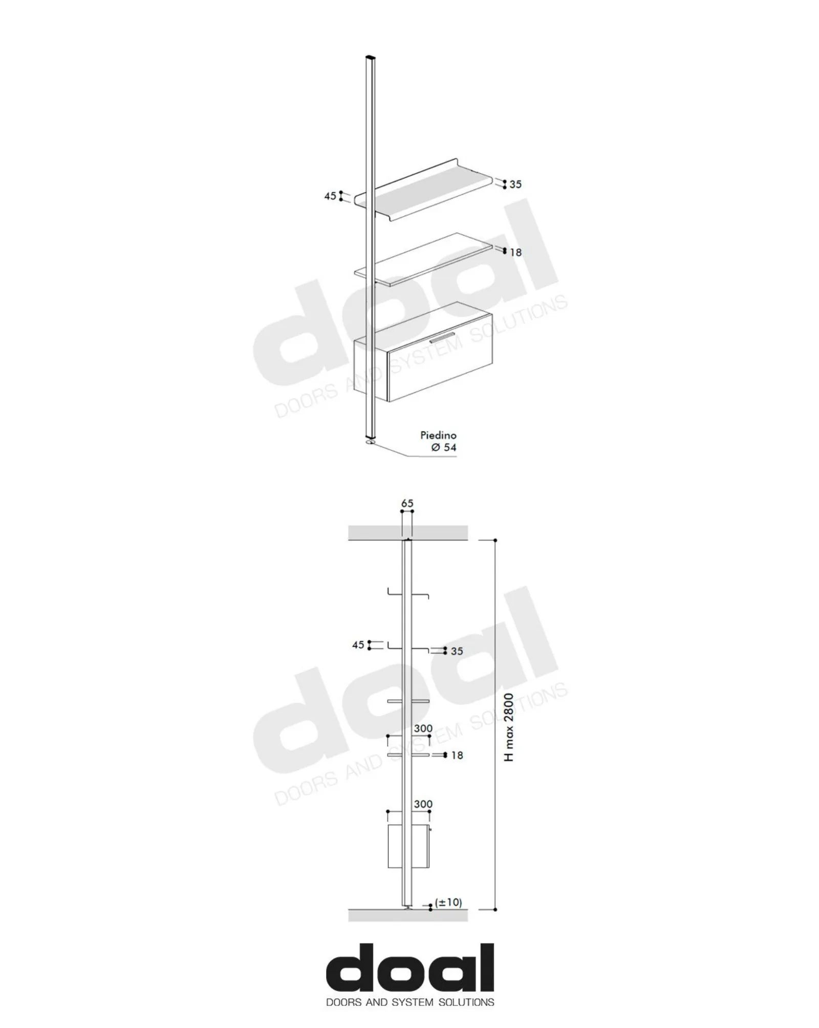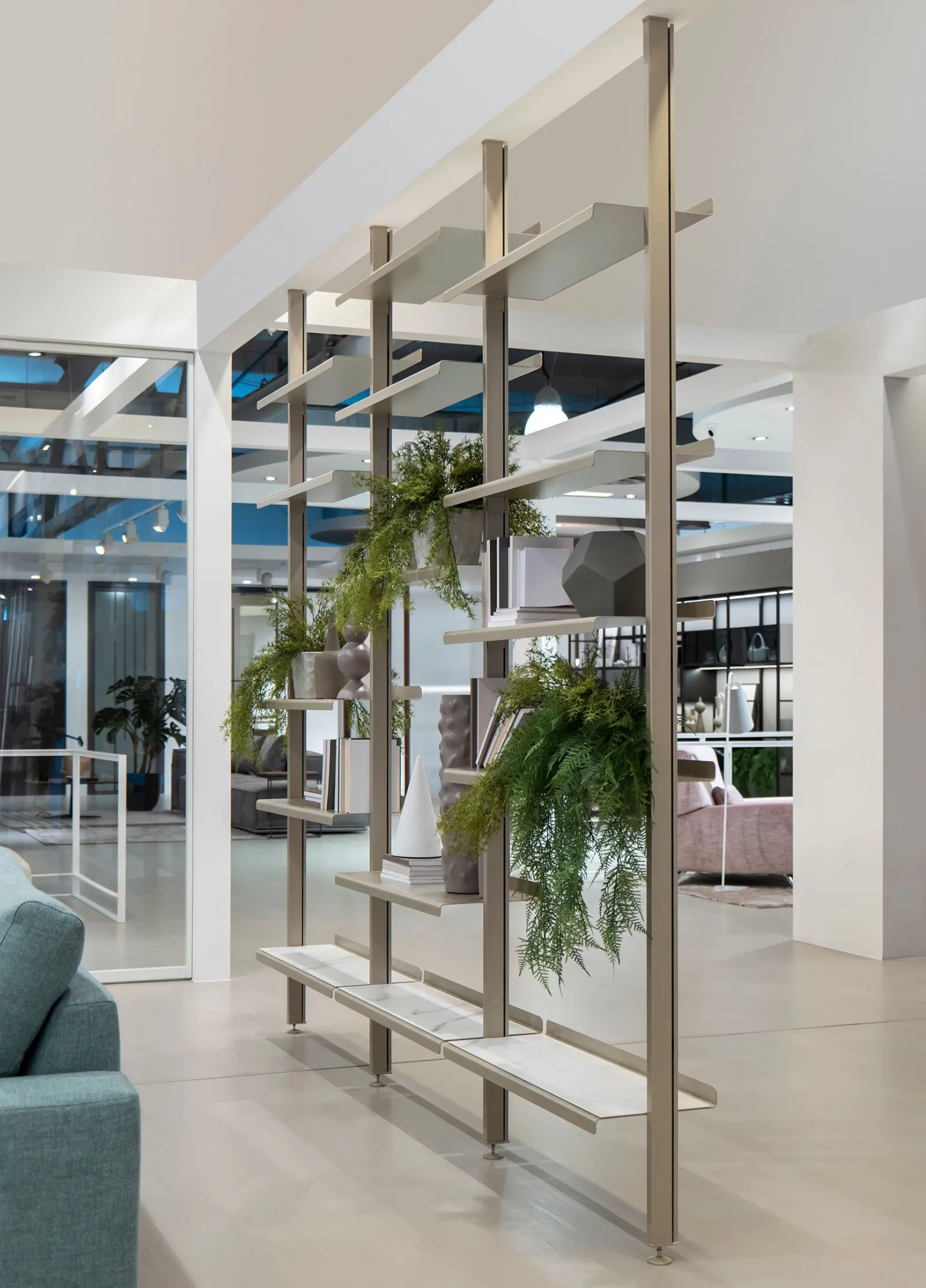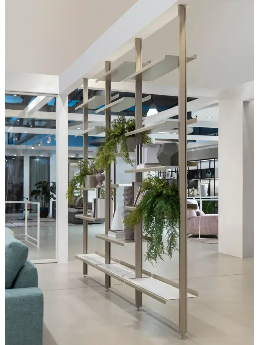 La libreria Karin a soffitto è disponibile con un’altezza massima di H 350 cm, i ripiani in acciaio hanno una modularità di L 60, L 90, L 120 cm, il top decorativo opzionale è disponibile in diverse tipologie di vetro o Laminam.