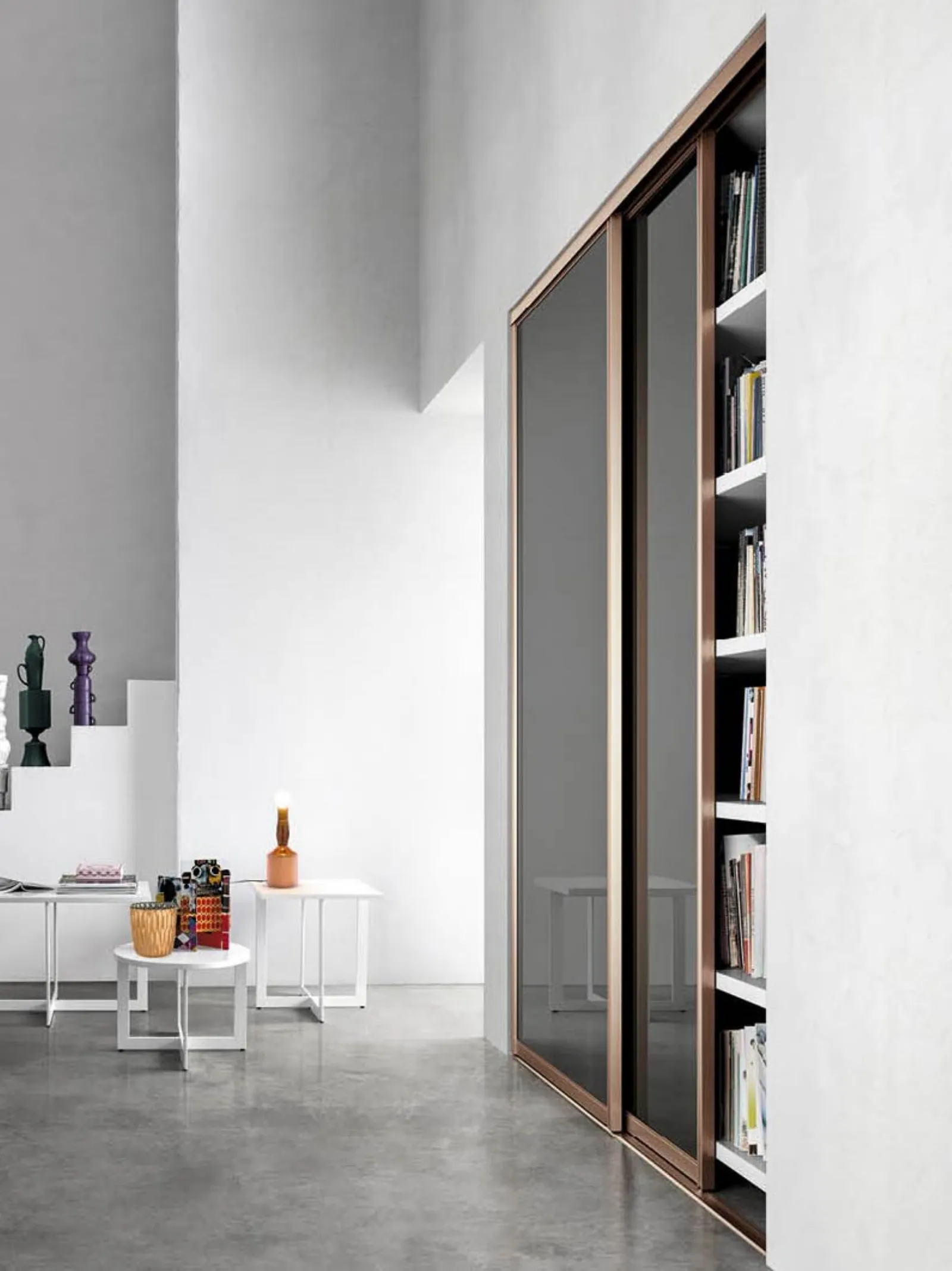 Il modello Like scorrevole a terra con vetro reflex è una soluzione ideale per la chiusura di nicchie adibite a dispensa o ripostiglio, grazie all'effetto riflettente ed elegante del vetro, nel caso di questa immagine nella versione fumé satinato. I profili in finitura rame caratterizzano poi decisamente la composizione.