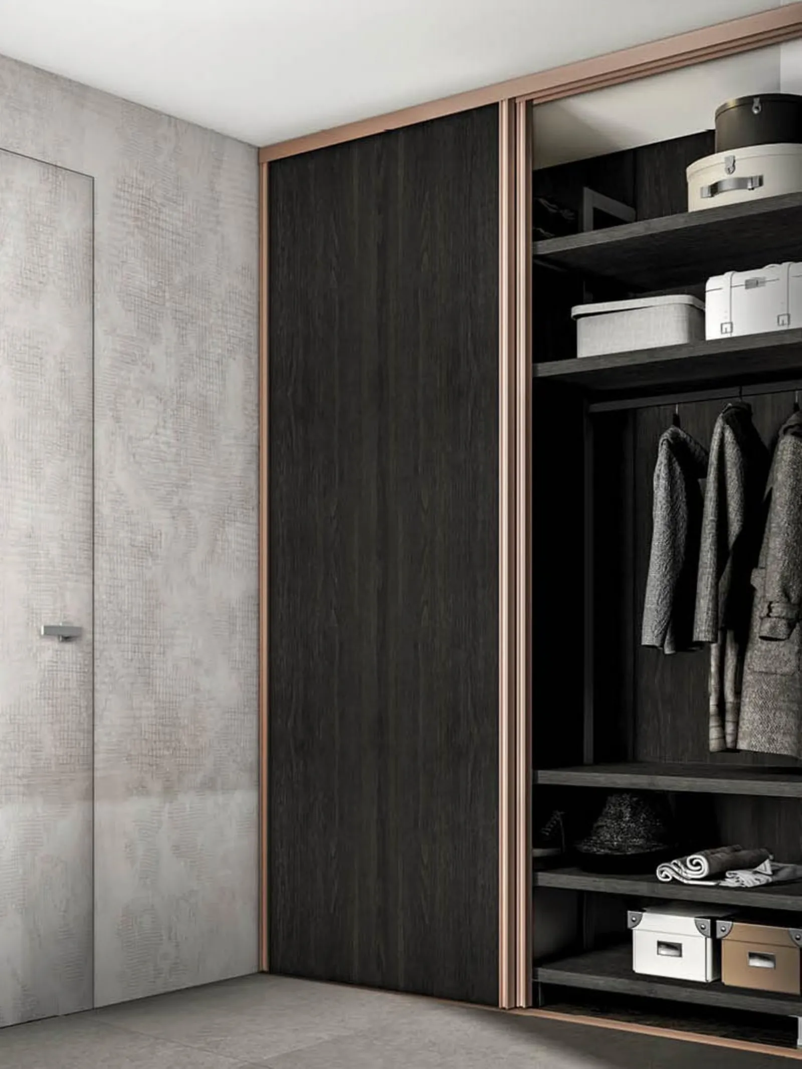 Il modello Like.18 scorrevole a terra è una soluzione ideale per la chiusura di nicchie adibite ad armadio con ante scorrevoli. Il binario a terra permette di non caricare il peso sul soffitto e di scegliere ante con pannello in nobilitato che arriva fino a terra, con soli i profili maniglia in verticale a caratterizzare le ante, magari con una tinta rame come nel caso di questa immagine.