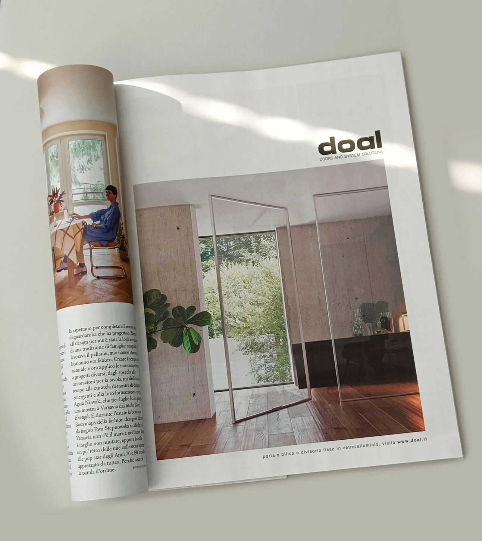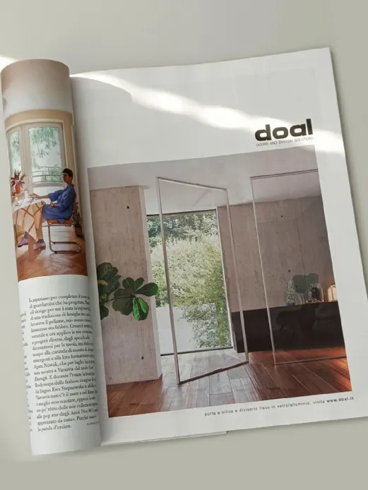 La porta Gaia a bilico presenta un vetro su un lato del profilo in alluminio ed è dotata di cerniere oleodinamiche a pavimento e soffitto che permettono l'apertura sia a spingere che a tirare.