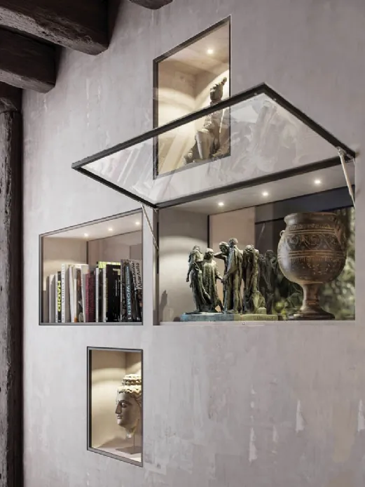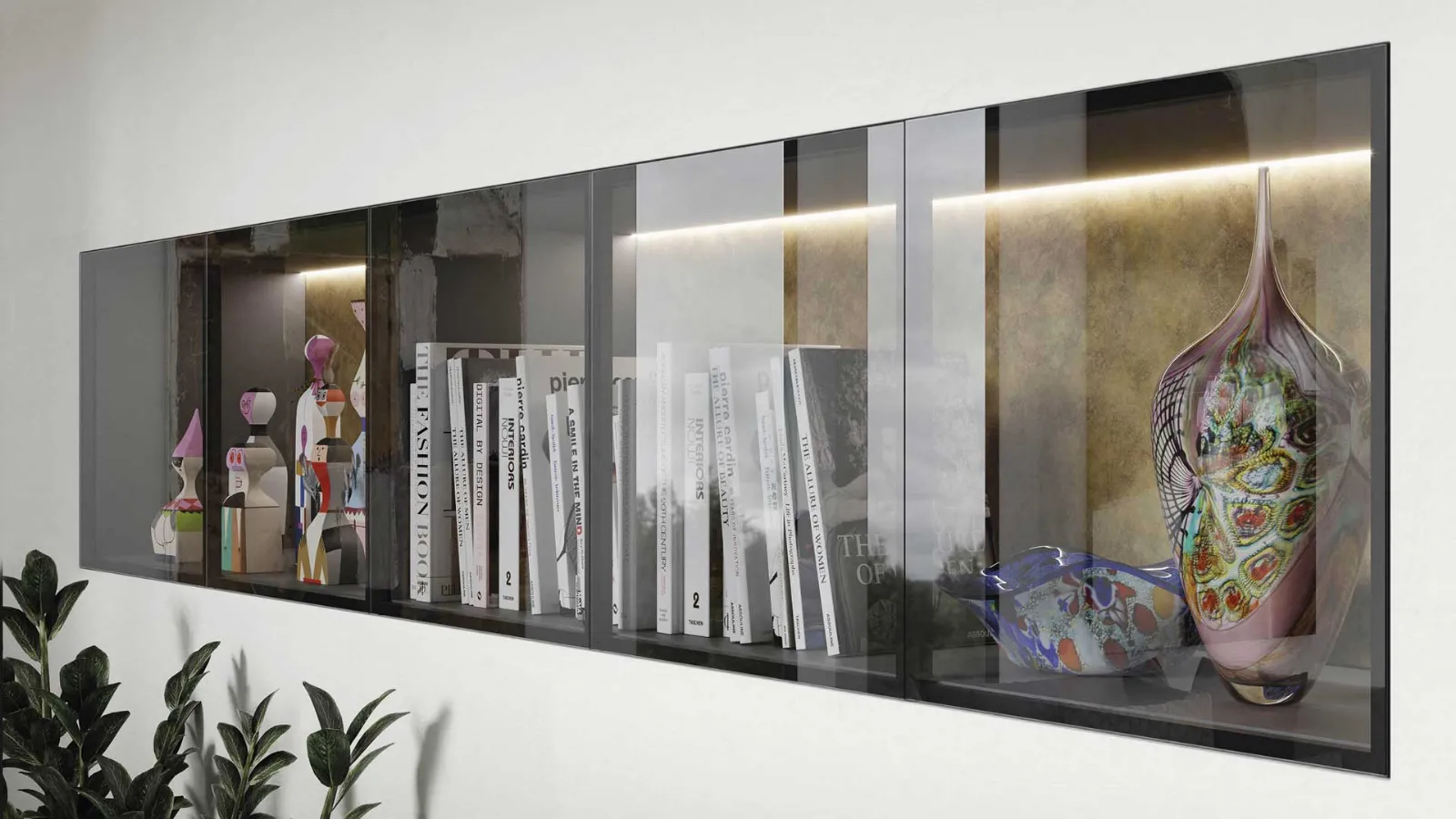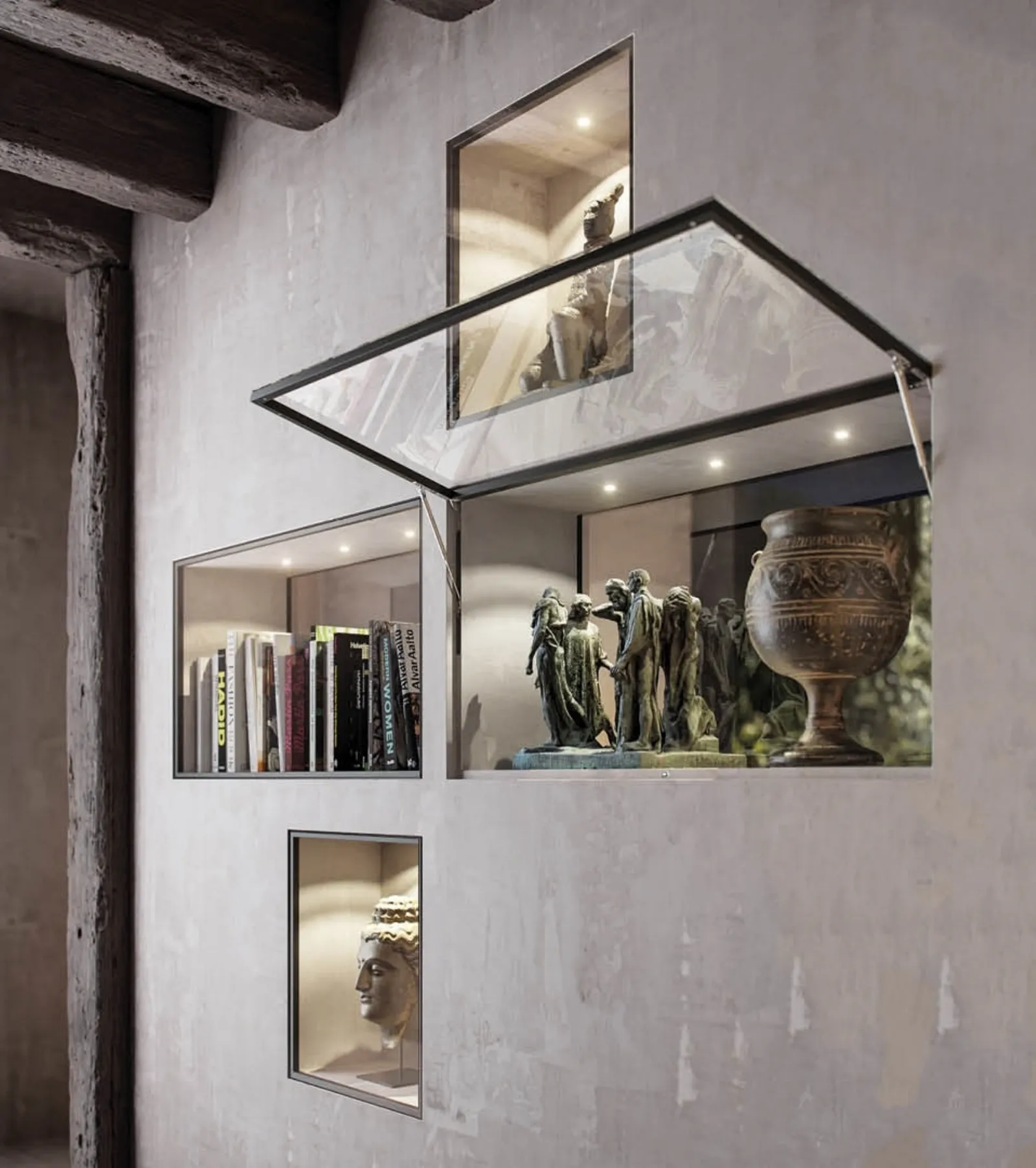 Le nicchie filo muro possono essere realizzate con apertura a battente oppure a ribalta, verso l’alto o verso il basso. Le cerniere sono invisibili e l’apertura avviene mediante push&pull; nella versione a ribalta inoltre viene applicato anche un sistema con pistone a gas accuratamente nascosto nella struttura. Sistema particolarmente adatto per far vedere i nostri oggetti più preziosi.