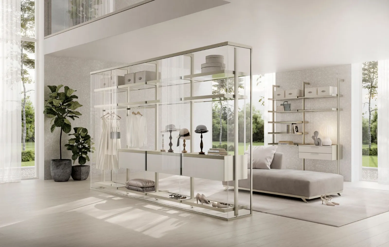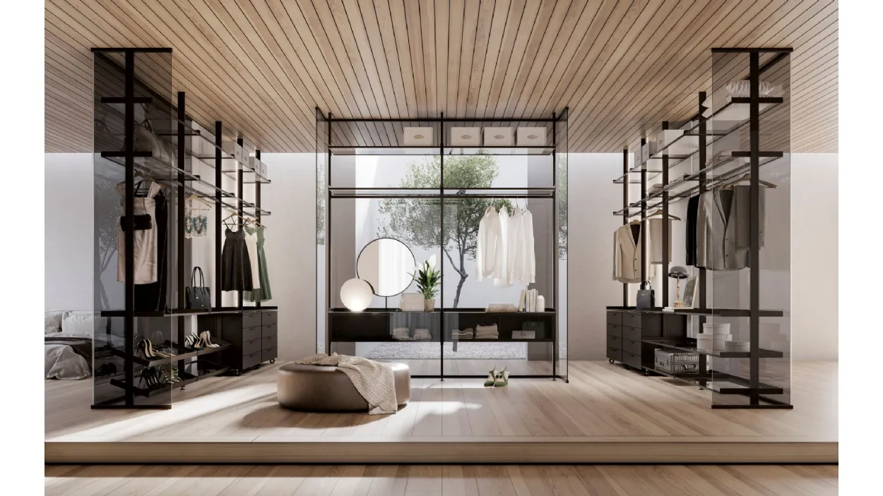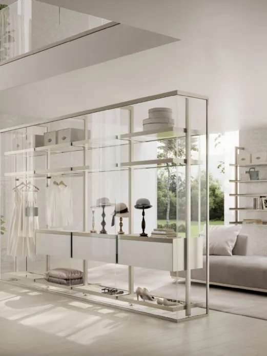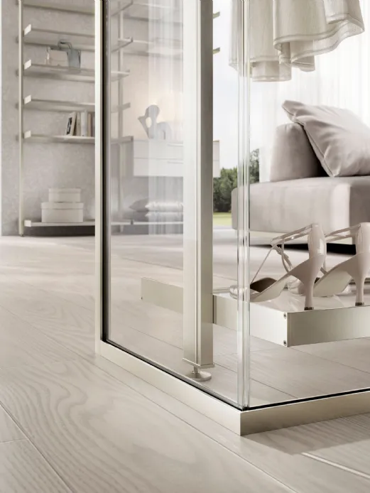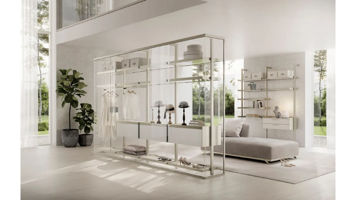 La soluzione parete Kristal avvolge e definisce con i suoi profili in alluminio Champagne e vetro Trasparente Extrachiaro la cabina armadio Venere, con i profili nella stessa finitura, i ripiani sempre in vetro Trasparente Extrachiaro e cassettiere laccate Tortora, completano e caratterizzano un elemento di design divisorio solido ma con trasparenze e riflessioni che esaltano l'ambiente.