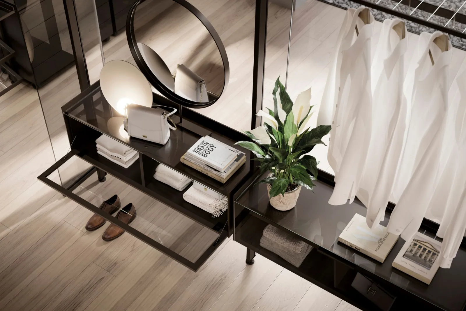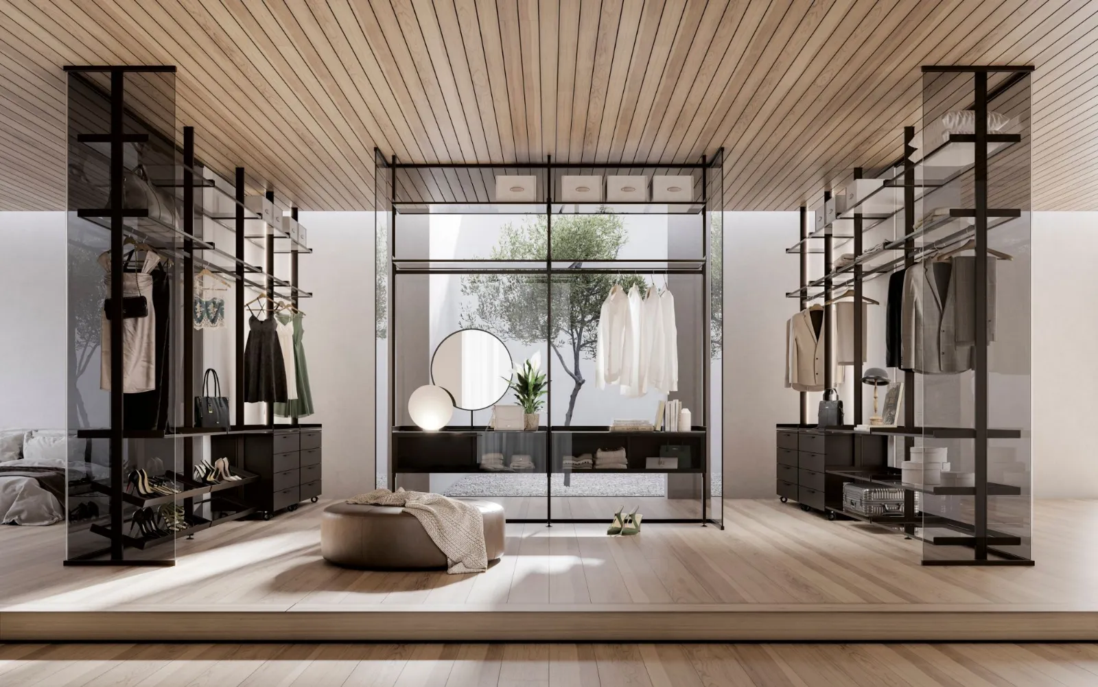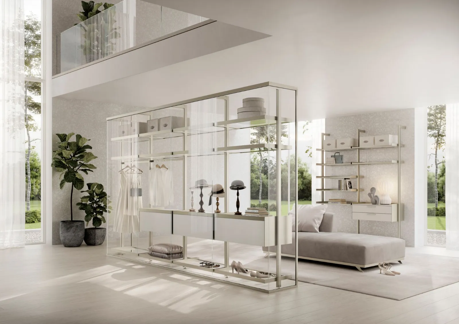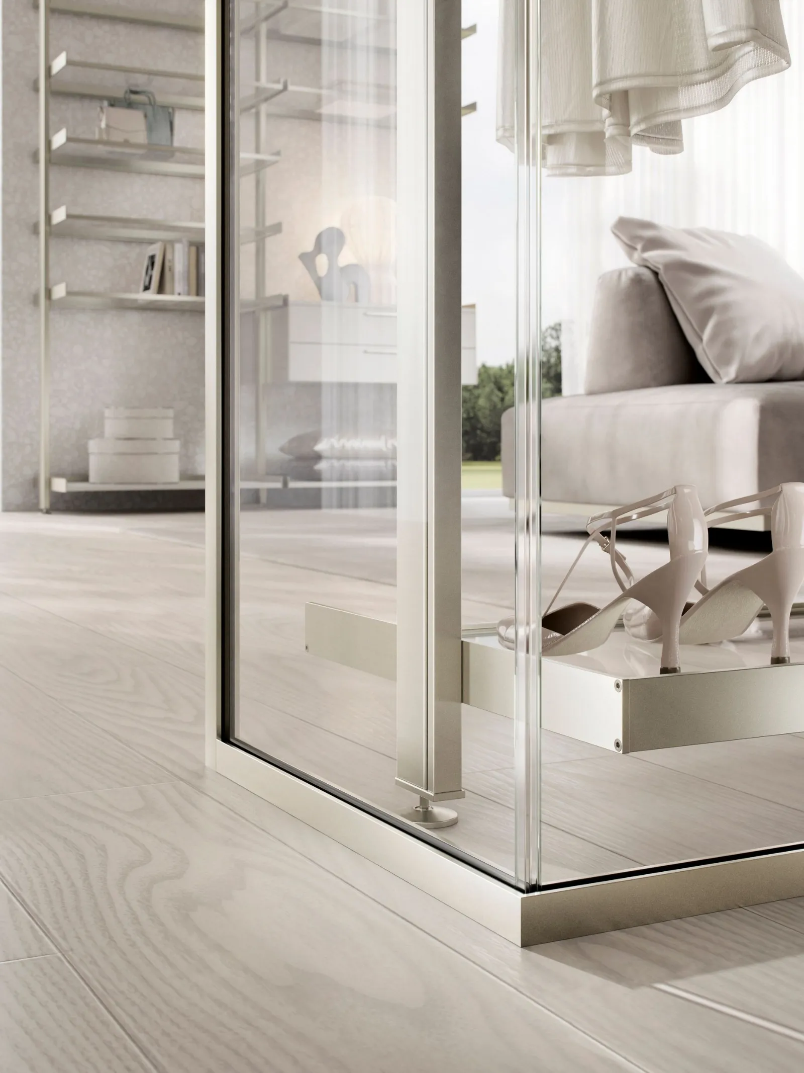 La soluzione parete Kristal avvolge e definisce con i suoi profili in alluminio Champagne e vetro Trasparente Extrachiaro la cabina armadio Venere, con i profili nella stessa finitura, i ripiani sempre in vetro Trasparente Extrachiaro e cassettiere laccate Tortora, completano e caratterizzano un elemento di design divisorio solido ma con trasparenze e riflessioni che esaltano l'ambiente.