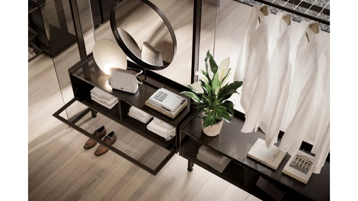 Il profilo in alluminio finitura Champagne ed il vetro trasparente Extrachiaro sono protagonisti in questa composizione dalle geometrie ricercate e moderne. Kristal arricchisce la cabina armadio Venere ricreando lo spazio dove si possono riporre comodamente oggetti e abiti, lasciando intravedere l’ambiente circostante dai gusti raffinati.