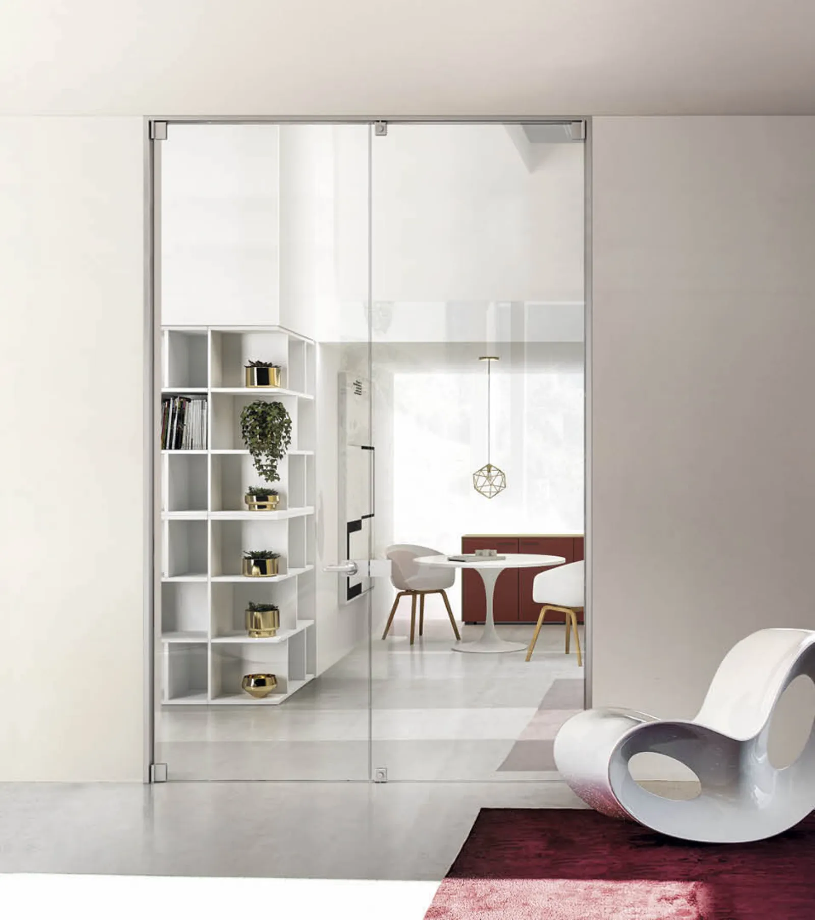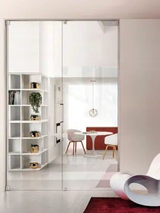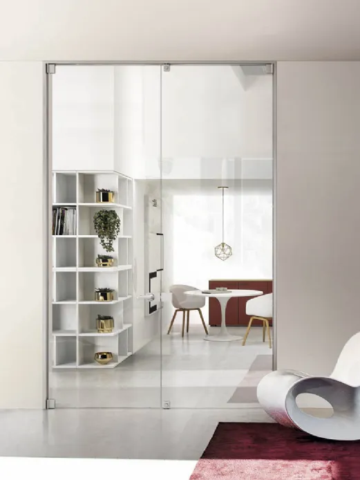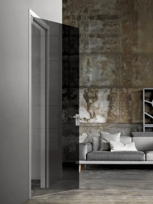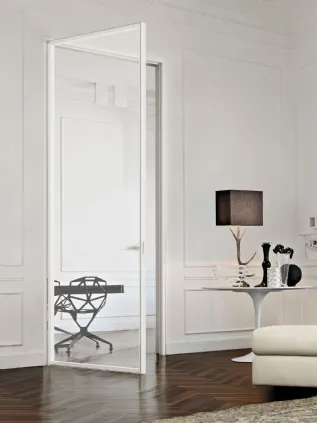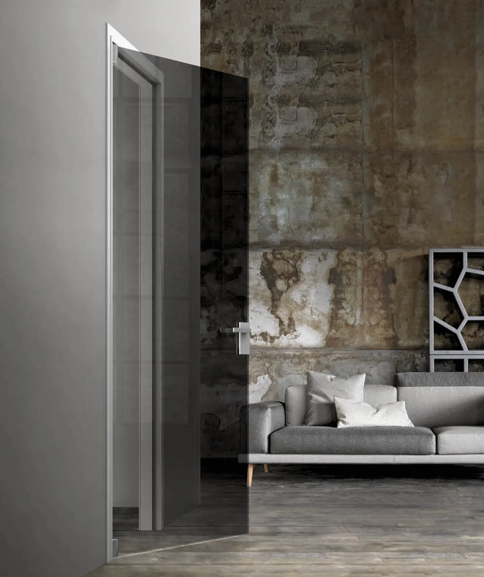 Doal ha progettato e affinato la variante in vetro di questo tipo di porta, con una soluzione unica di vetro a filo che si trova perfettamente complanare alla parete, senza neanche la minima interruzione dato che il profilo in alluminio della porta resta dietro il vetro. In questo modo si coniugano perfettamente il design minimalista delle porte filo muro alle trasparenze e ai giochi di luce che solo il vetro può offrire.