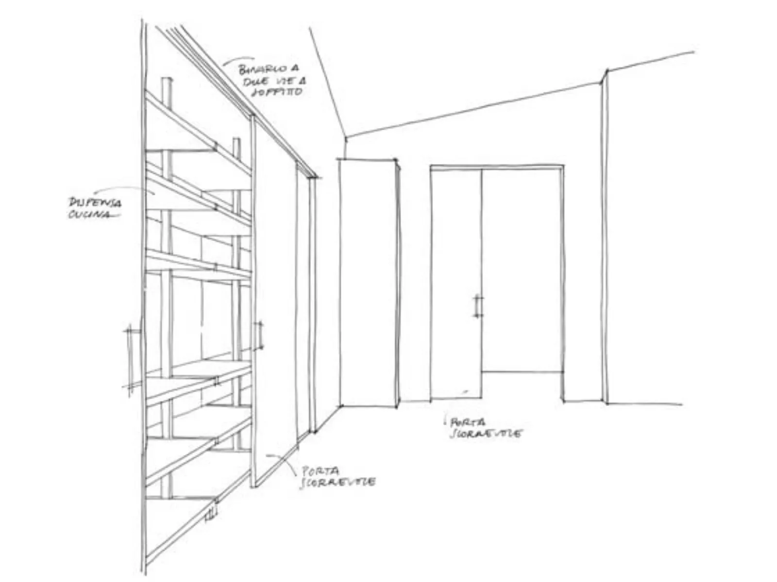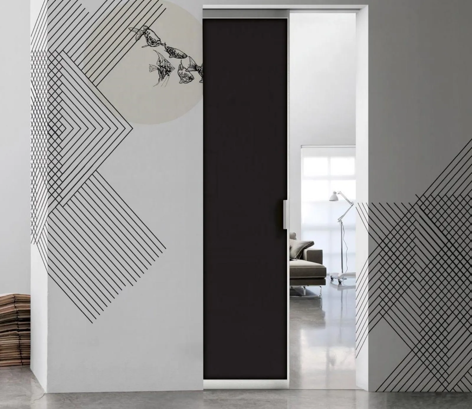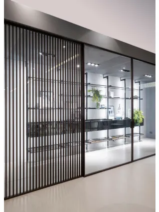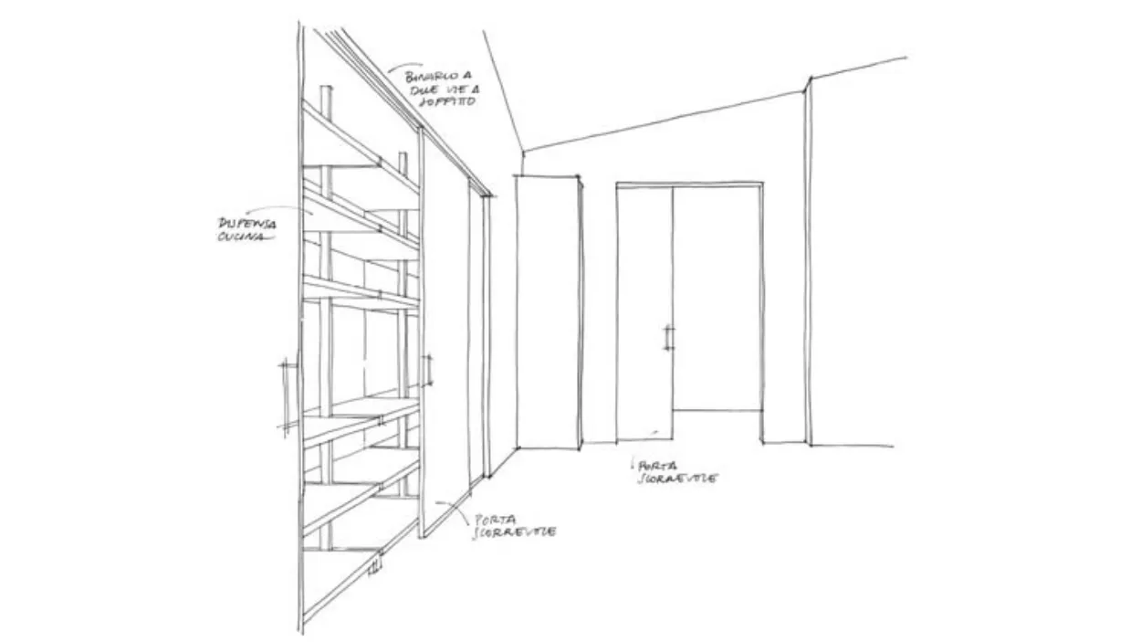 Per questo tipo di suddivisioni si scelgono le porte scorrevoli senza binario a terra, liberando del tutto, in qualsiasi momento, l’apertura che mette in comunicazione i due ambienti.