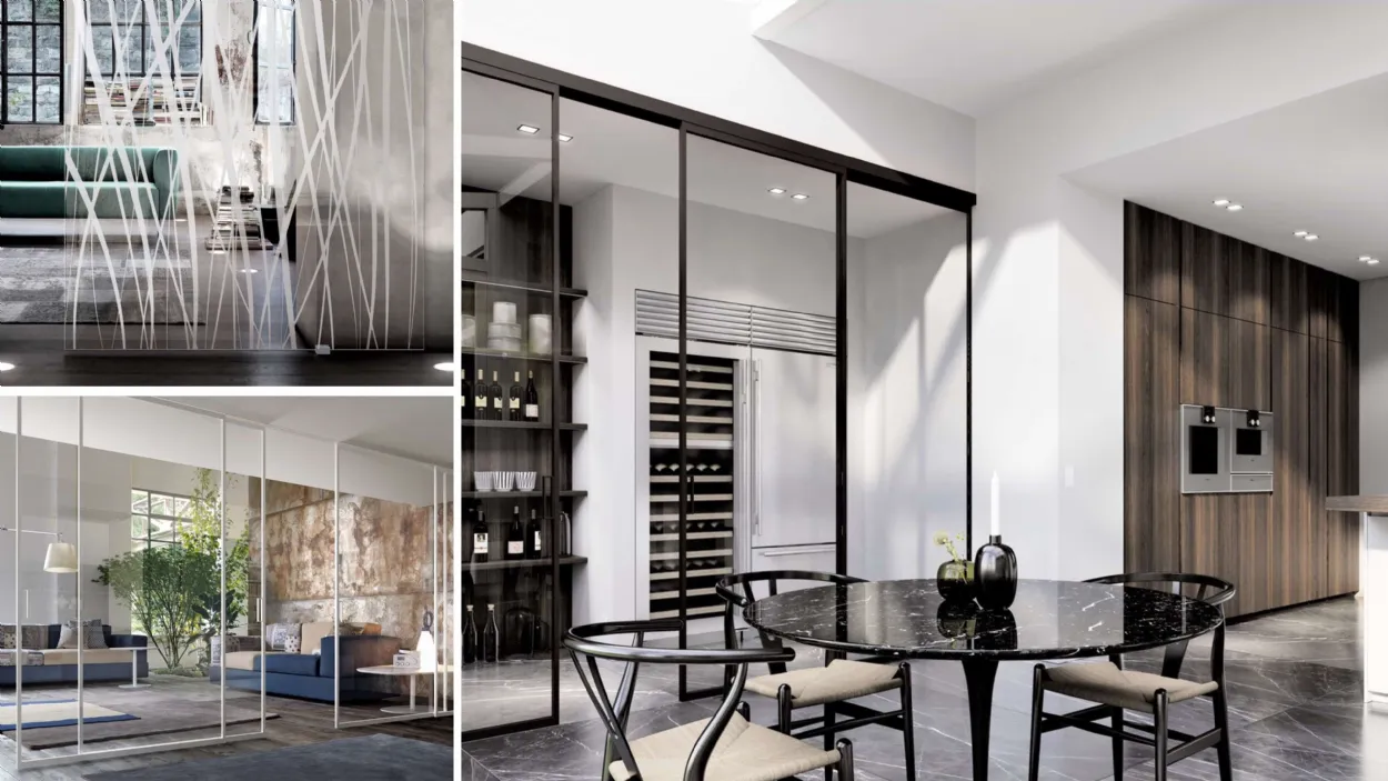 Per separare grandi ambienti come ad esempio dividere soggiorno e cucina è consigliabile l’utilizzo del vetro per non ostruire la vista, mantenendo inalterata l’atmosfera "open space" e definendo al tempo stesso una divisione degli spazi.