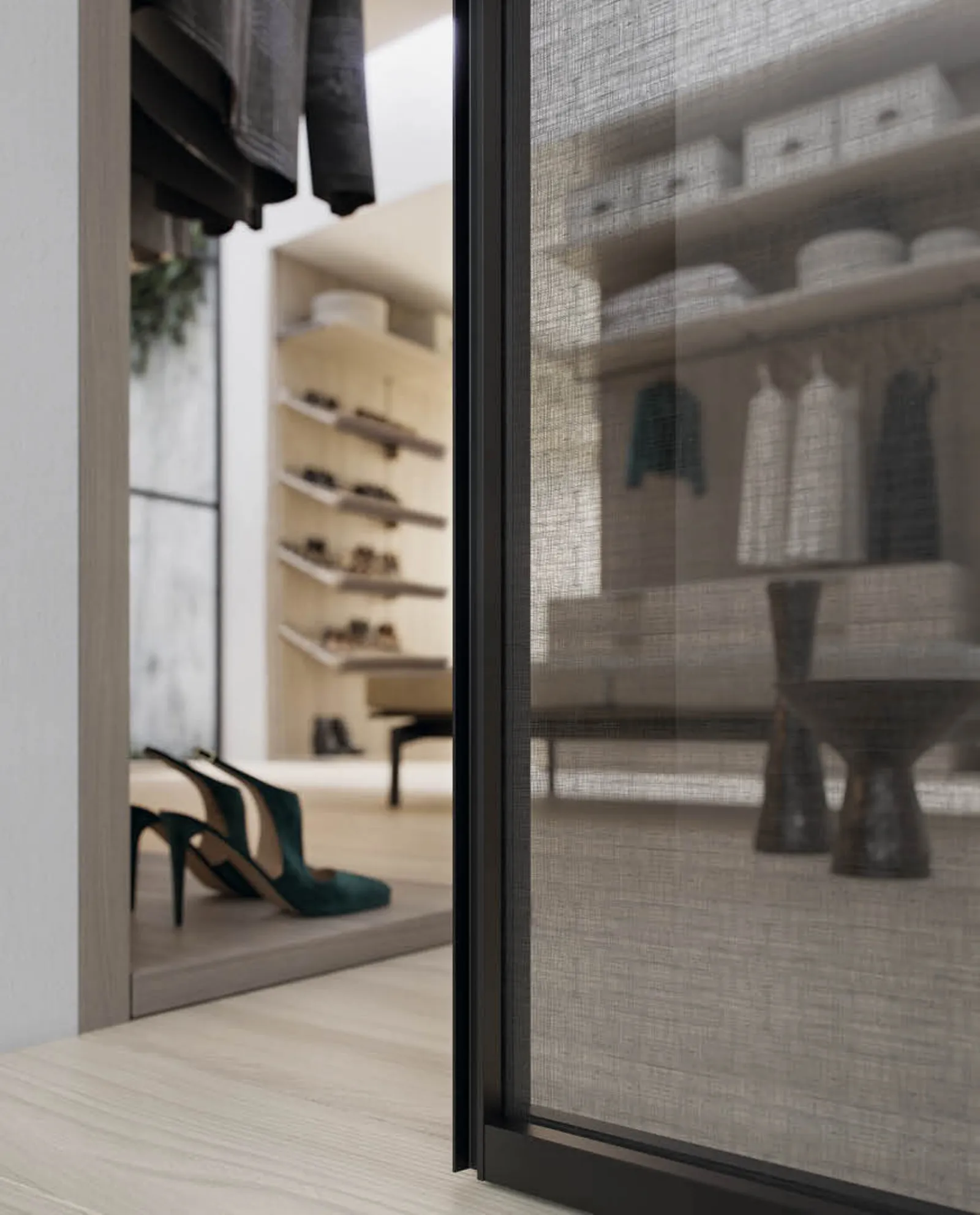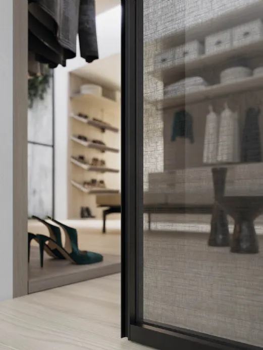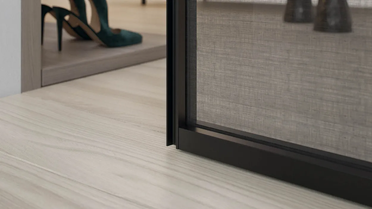Si possono scegliere le finiture per porte che meglio si abbinano al contesto dei locali: profili in alluminio o verniciati e porte in vetro trasparenti, fumé, bronzati o satinati per schermare e nascondere all’occorrenza un ambiente. La scelta meno invasiva e più neutrale è la classica anta a specchio anche su misura, riflettente per la cabina armadio nella zona notte e l’anta satinata o trasparente per la zona giorno.