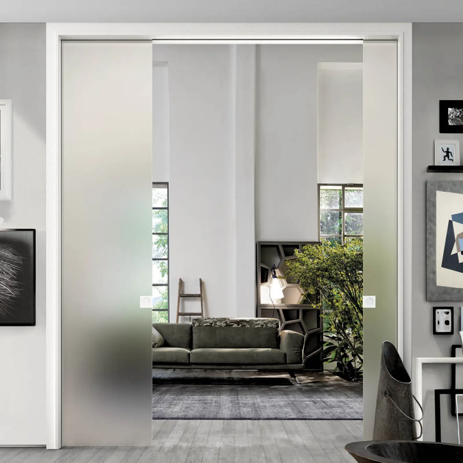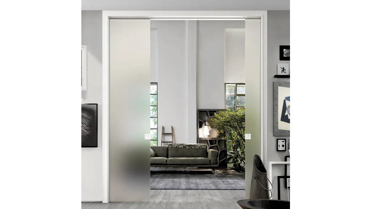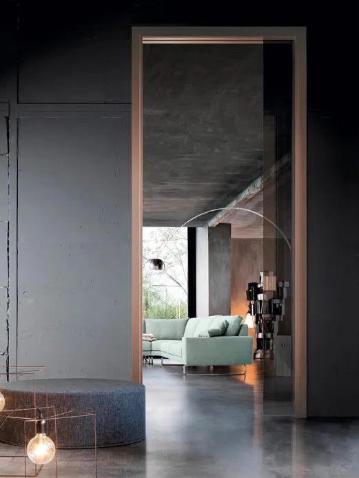Con la porta Tao scorrevole a scomparsa per controtelai tradizionali, con stipiti, come quella di questa immagine, si può scegliere di ridurre al massimo l'impatto estetico della porta, che non prevede un profilo perimetrale, e dare risalto alla cornice che contorna il foro di passaggio, scegliendo magari una finitura caratterizzante come il rame, ripresa anche per la maniglia.