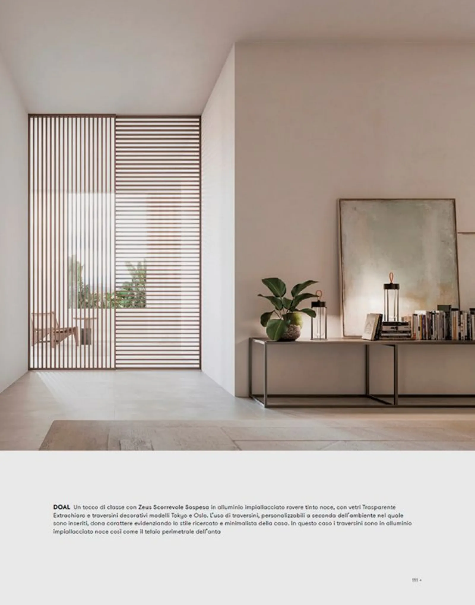 Un tocco di classe con Zeus scorrevole sospesa in alluminio impiallacciato rovere tinto noce, con vetri trasparente extrachiaro e traversini decorativi Tokyo e Oslo. L'uso dei traversini personalizzabili a seconda dell'ambiente nel quale sono inseriti, dona carattere evidenziando lo stile ricercato e minimalista della casa. In questo caso i traversini decorativi sono in alluminio impiallacciato noce così come il telaio perimetrale dell'anta.