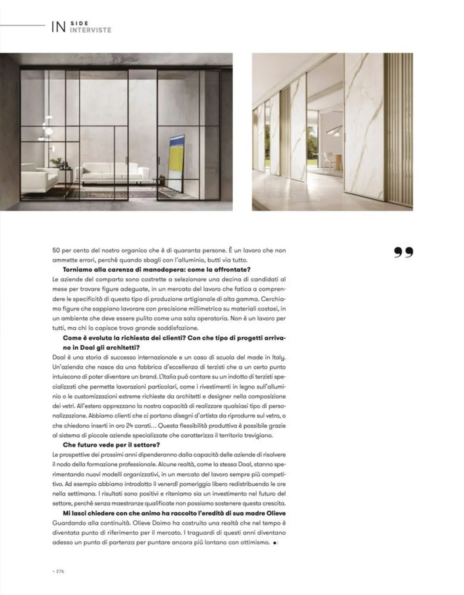 Le prospettive dei prossimi anni dipenderanno dalla capacità delle aziende di risolvere il nodo della formazione professionale. Alcune realtà, come la stessa Doal, stanno sperimentando nuovi modelli organizzativi, in un mercato del lavoro sempre più competitivo. Ad esempio abbiamo introdotto il venerdì pomeriggio libero redistribuendo le ore nella settimana. I risultati sono positivi e riteniamo sia un investimento nel futuro del settore, perché senza maestranze qualificate non possiamo sostenere questa crescita.