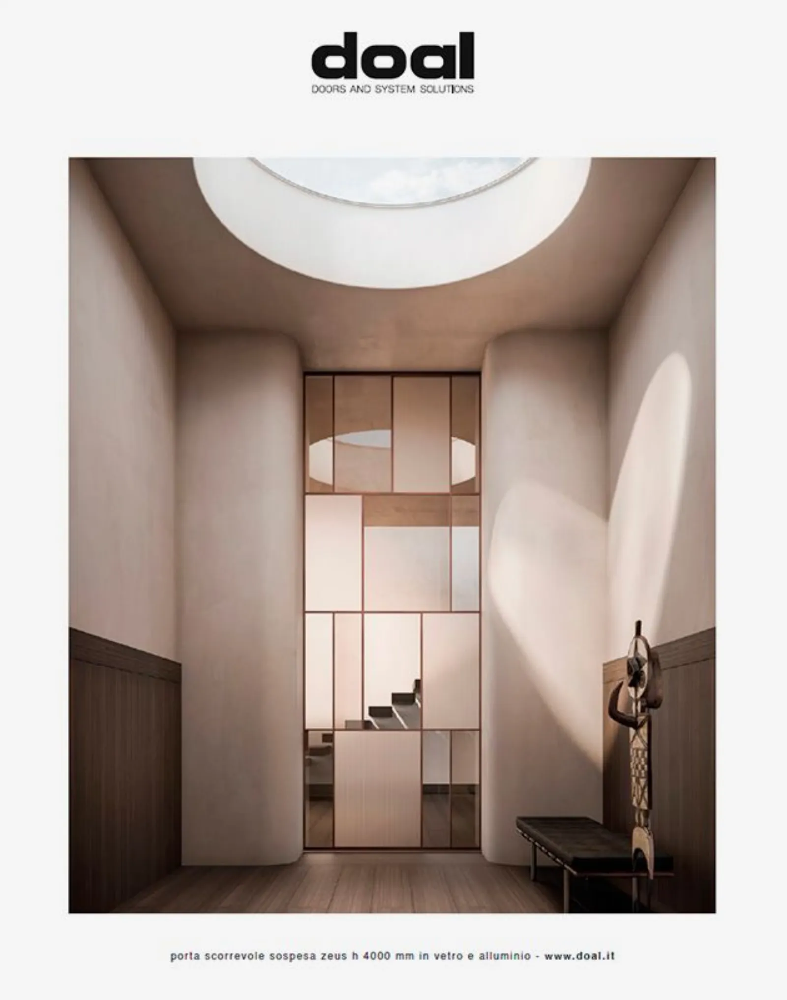 Con Doal puoi creare un tocco di classe nell’ambiente grazie a Zeus Scorrevole Sospesa in alluminio Corten, vetri Bronzo, Reflex Bronzo e Millerighe Bronzo con traversini decorativi modello Parigi Evo e maniglia Vertical. La porta diventa così un vero e proprio oggetto di arredo in grado di caratterizzare lo spazio, la sua altezza di ben 4 metri la rende protagonista dell'ambiente, esaltando la divisione fra una zona e l’altra.