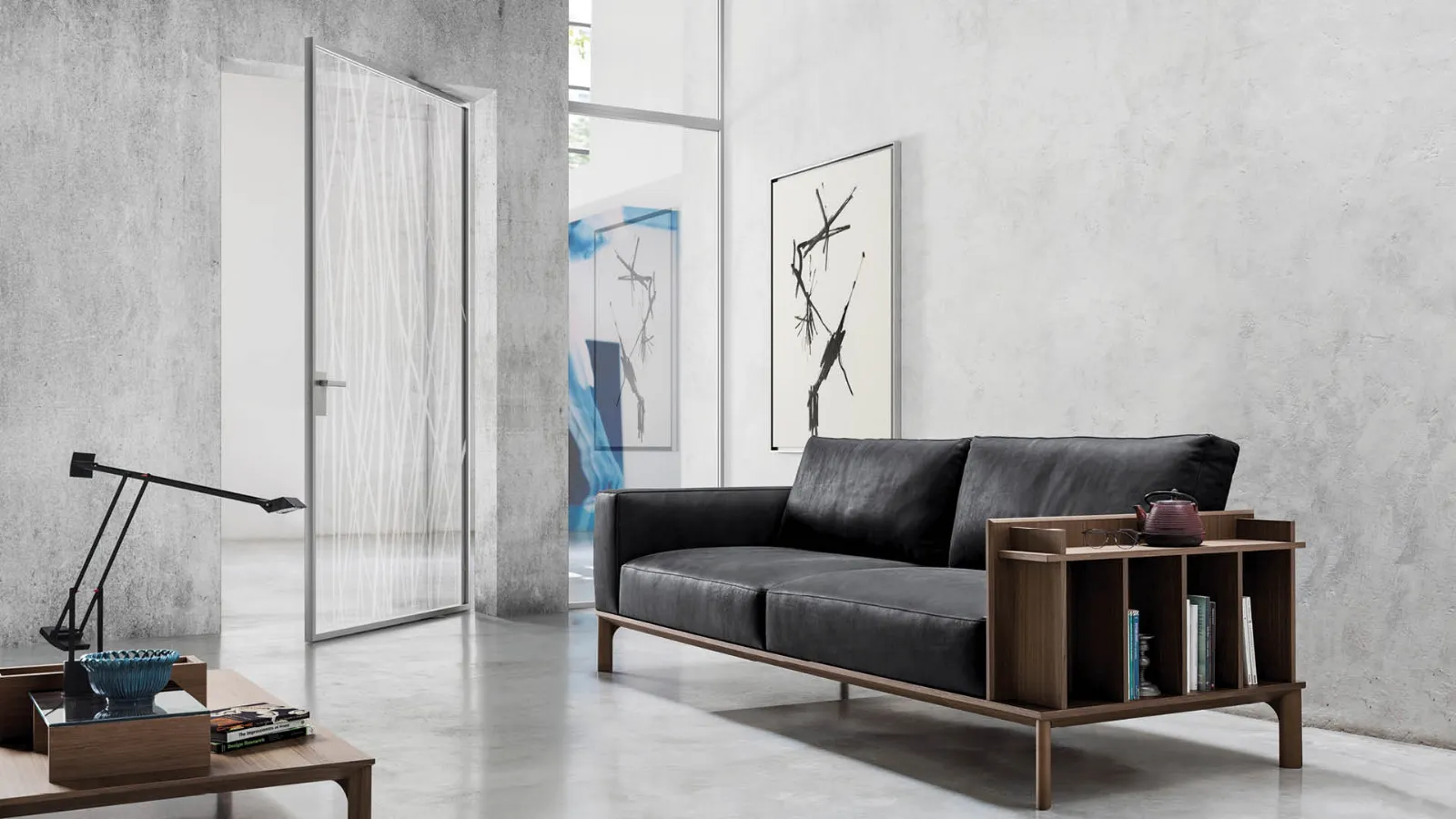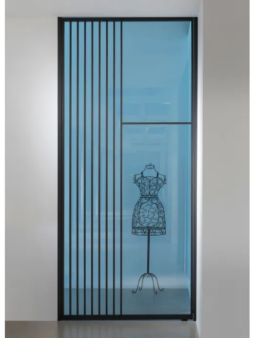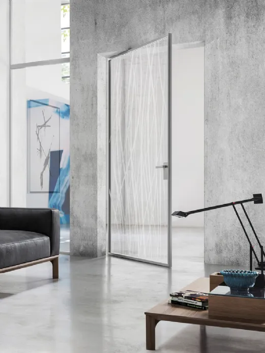 Non necessitando di stipiti laterali e traverso superiore, come le normali porte a battente, ha una linea decisamente più moderna e minimalista. Appare come una quinta che può ruotare in entrambe le direzioni per definire lo spazio e la luce di passaggio. Le cerniere oleodinamiche richiudono la porta dolcemente e la tengono bloccata quando è aperta a 90°, garantendo un’ottima funzionalità nella vita di tutti i giorni.