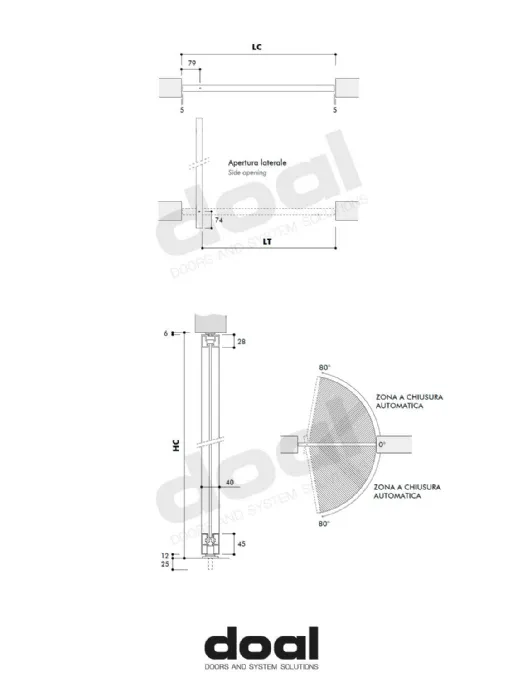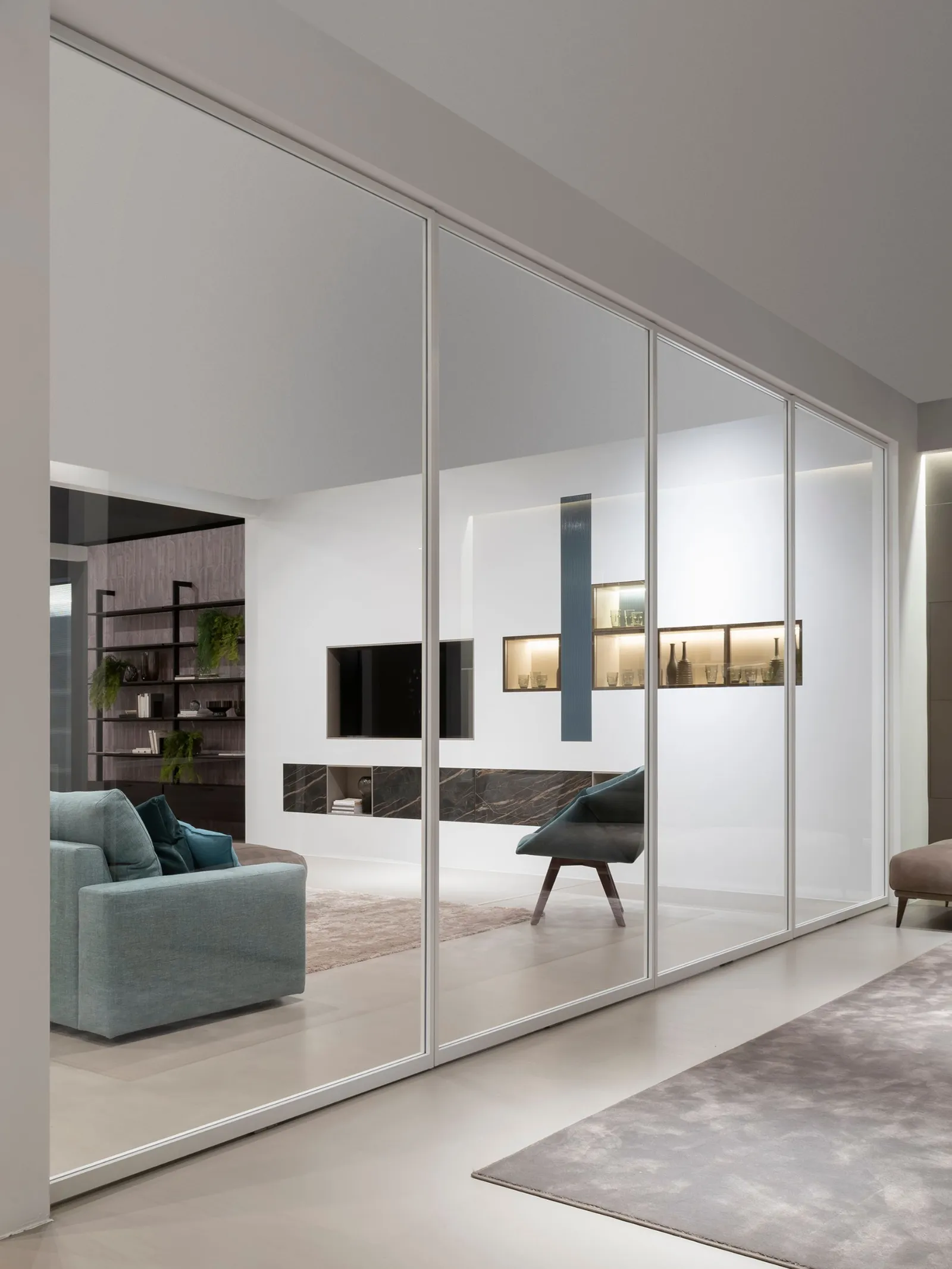 La porta Zeus a bilico ha un profilo perimetrale in alluminio ad incorniciare il vetro o il pannello scelto. Grazie alle cerniere oleodinamiche la porta si apre in entrambe le direzioni e si richiude autonomamente, senza stipiti laterali e con solo una piccola maniglia appena percettibile per tirare l'anta.