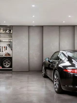 La Zeus scorrevole a terra consente l'installazione di porte anche con soffitti non rinforzati. Sul pavimento viene fissato un binario alto 6 mm, anche senza bisogno di fori. Il profilo in alluminio contorna la porta e in basso nasconde le ruote di scorrimento.